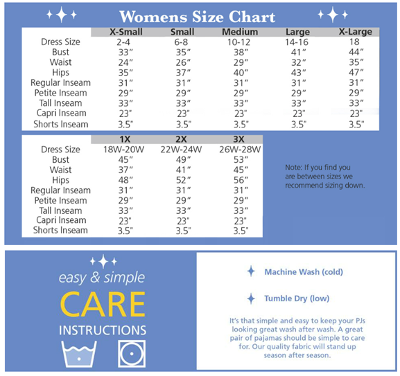 Find the Perfect Size - Our pajamas for women have been designed by sleepwear experts to fit a range of bodies; below you will find a size chart to help you find your perfect fit.