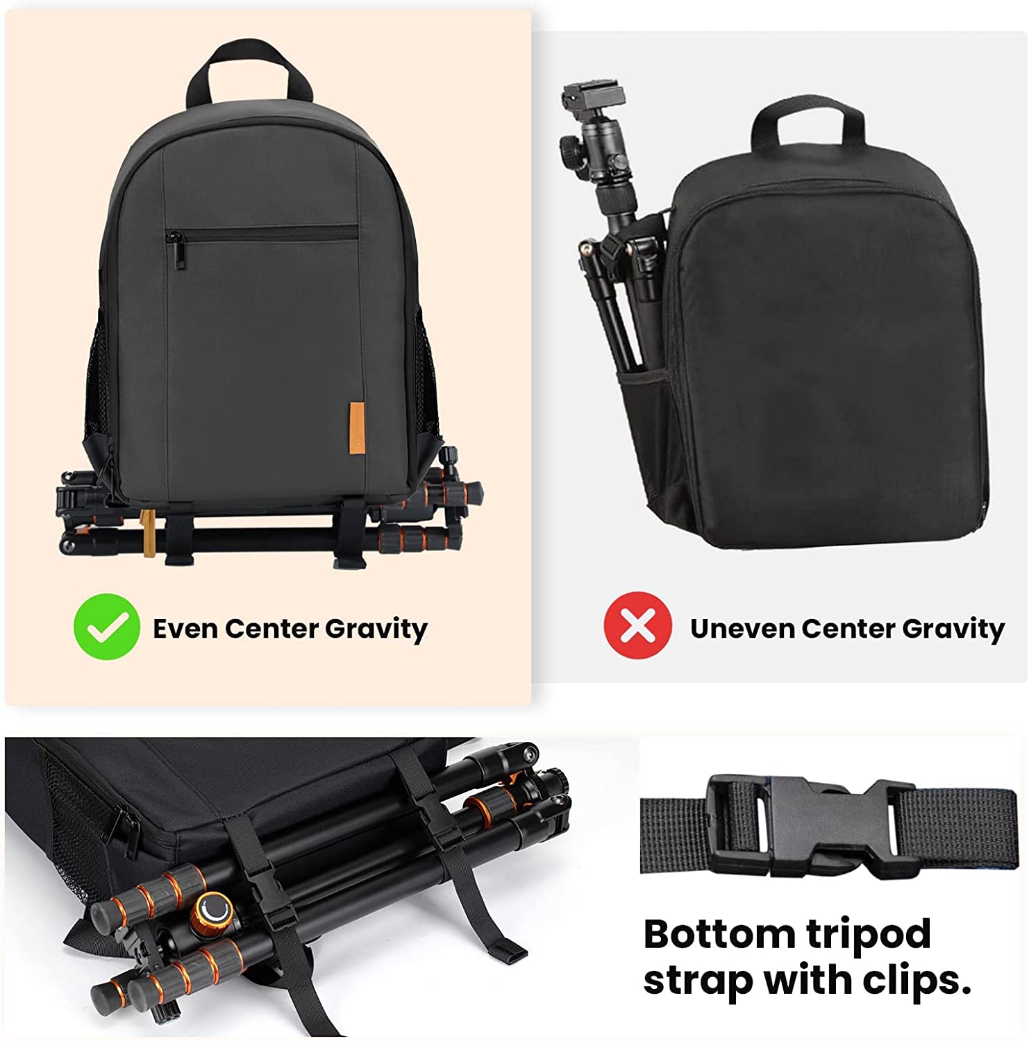 - 【BOTTOM TRIPOD STRAPS WITH CLIPS】Tripod or monopod can be attached to the bottom with straps which does not alter the center of gravity because the weight of both the tripod and the backpack are uniformly distributed, which aids comfort when carrying.