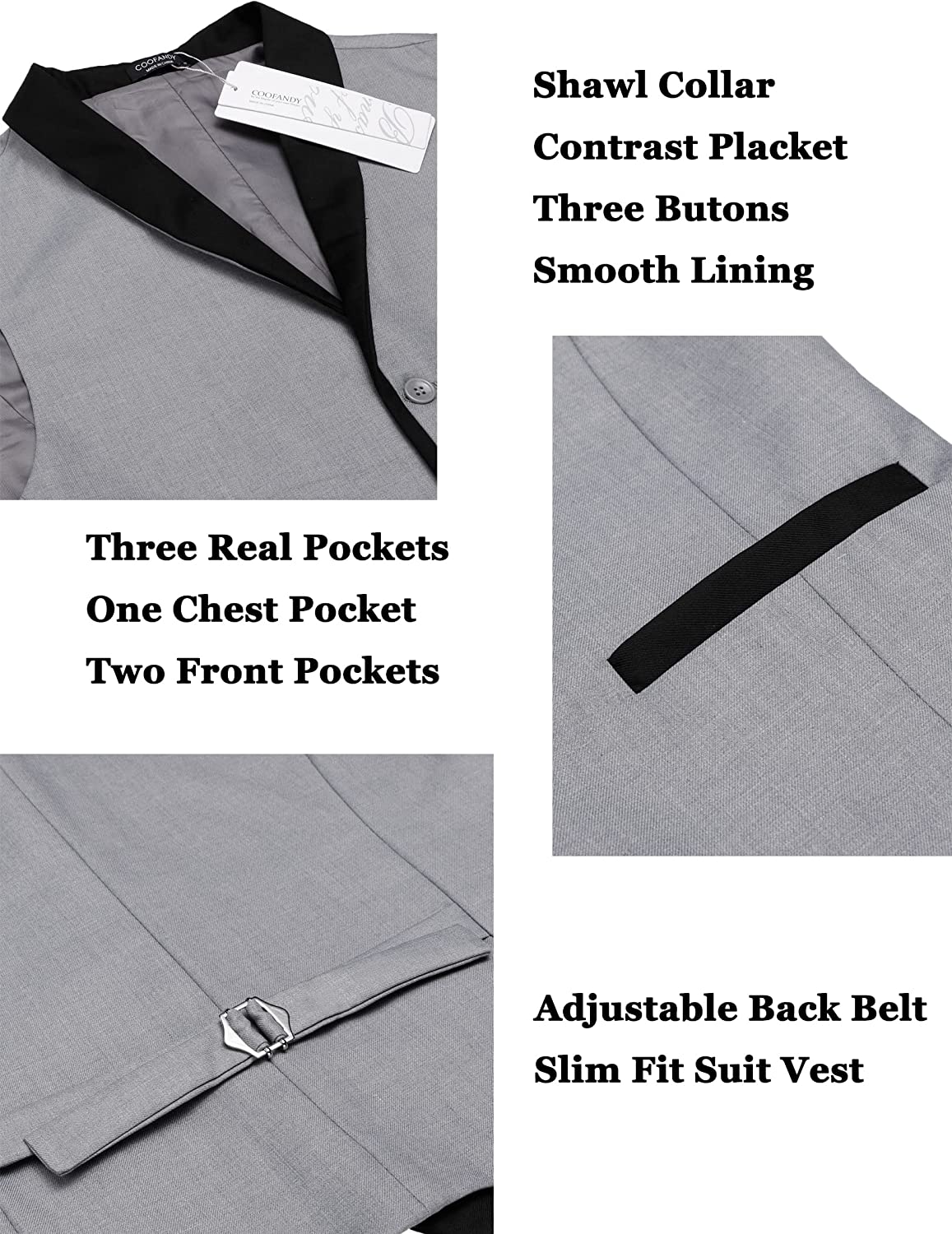The Men's suit vest design with shawl collar, Two real side pockets and one real chest pocket;Adjustable back belt,3 Buttons V-neck men's dress vest,New Stylish slim fit style black grey,blue vest for men