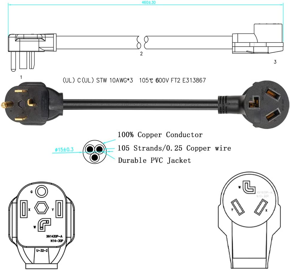 - 【Adapter for 240-Volt Electric Clothes Dryers】Dryer Outlet Ddapter, Dryer adapter cord 14-30 Plug to 10-30 Receptacle, NEMA 14-30P 4-prong male electrical plug is 125/250V, NEMA 10-30R 3-prong female plug connector is 250V. 30 AMP, Max wattage 7500W-Black