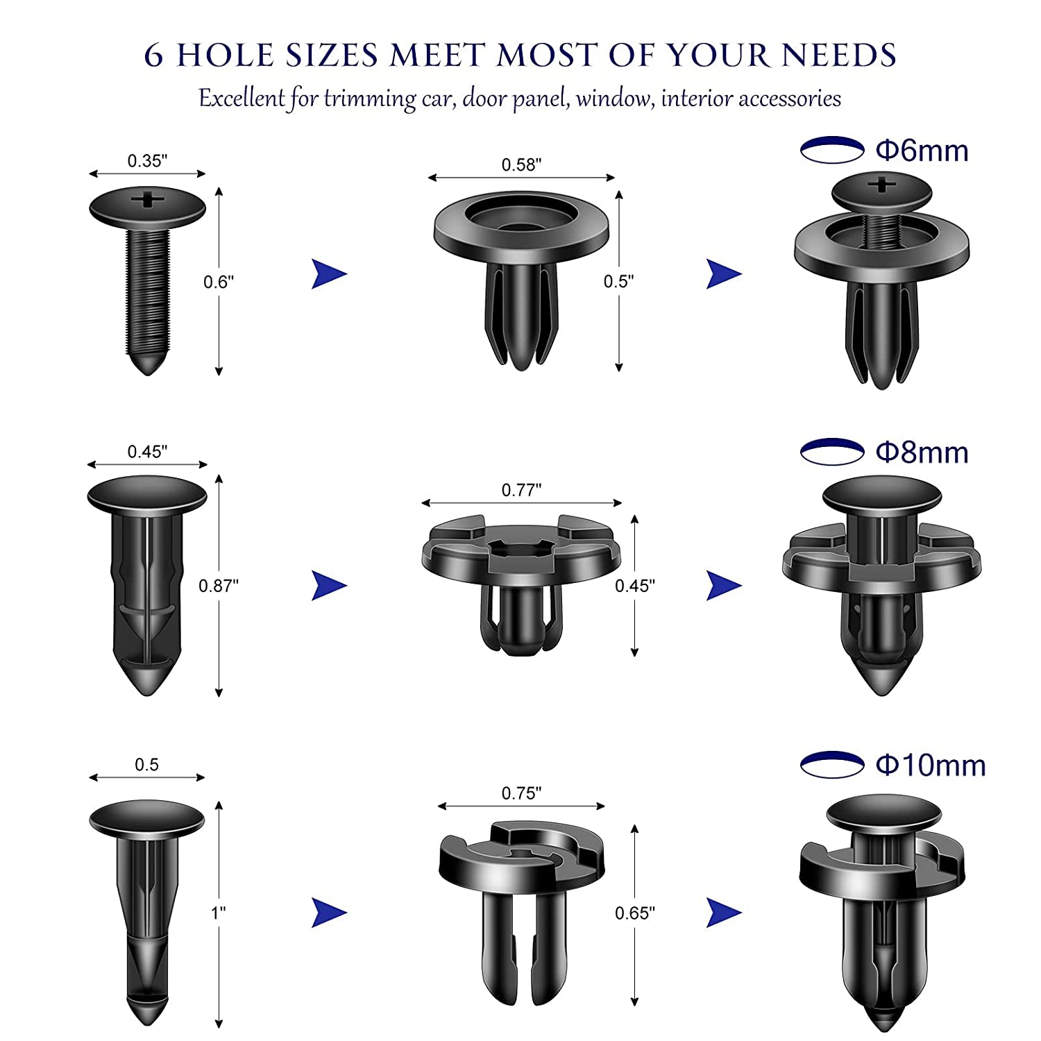 Widely Application : Great Assortment Push Retainer Kit with 6 popular size, push clips are widely used for trim panel clips, door trim clips, door panel clips, bumper clips, Fender clips, engine cover and splash shield retainers replacement for Ford, GM, Chrysler, Toyota, Honda.