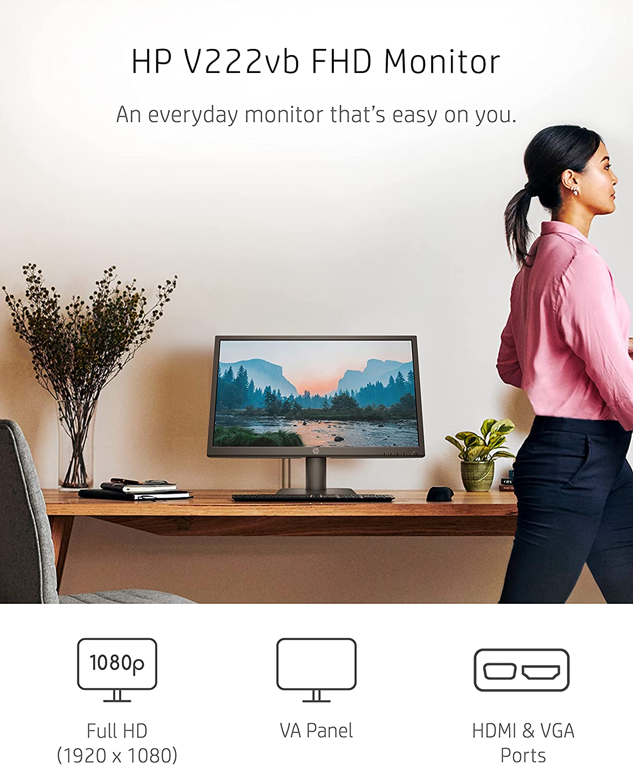 Browse the web, stream your shows, and get work done on the everyday HP V222vb FHD Monitor. This HP computer monitor’s 21.5-inch Full HD screen boasts unparalleled visuals every time you turn it on (1). What’s more is that the 1080p monitor features a 75Hz refresh rate for smoother images, plus a superb contrast ratio for better color differentiation (2). No matter where you view your HP monitor, the VA panel ensures image clarity is maintained across ultra-wide 178-degree horizontal and vertical viewing angles. Easily connect a laptop, an external storage drive, or an additional monitor with the HDMI and VGA ports. Get the most out of a PC monitor designed for both comfort and efficiency. The TÜV certified Low Blue Light Mode limits the strain put on your eyes, while the tilt-adjustable display ensures comfortable posture all day. Beyond this HDMI monitor’s comfort settings, the narrow bezel design keeps things stylish and productive, letting you see more of your favorite show or word document. Customize your display with ease thanks to the intuitive HP Display Center software; through the host PC, you can personalize every little detail from display settings, screen partitioning, and even dimming the screen. Further customize the way you use this monitor with standard 100 x 100 millimeters VESA mounting options (3). This 75Hz monitor’s energy-efficient design isn't just for you but the environment too, as your device reduces power consumption and energy costs. Plus, the materials used in the packaging are 100% sustainably sourced and recyclable (4). Rest easy as your monitor is covered by an HP 1-year limited hardware warranty. (1) Full high-definition (FHD) content is required to view FHD images. (2) During video playback only, depending on series of frames or time duration. (3) Bracket not included. (4) 100% outer box/corrugate cushion packaging made from sustainably sourced certified and recycled fibers. Fiber cushions are made from 100% recycled wood fiber and organic material. Excludes plastic bags and plastic foam sheeting. 06/04/2021_r1 tg