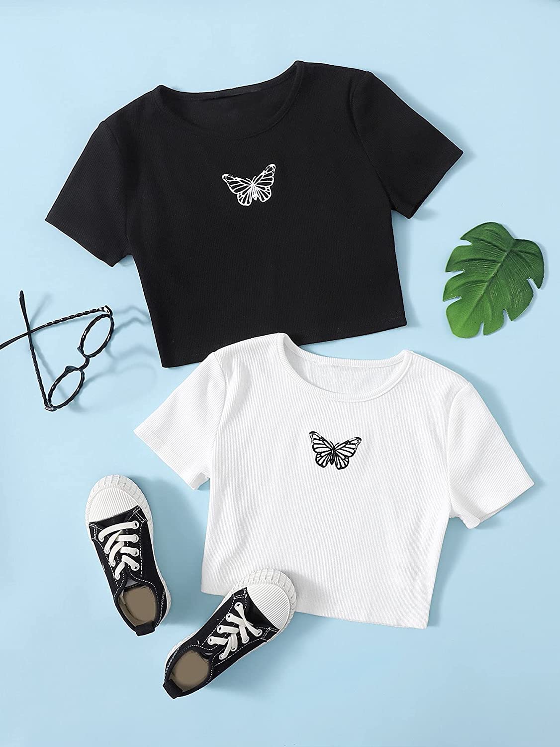 Romwe Girl's 2 Pack T Shirt Graphic Butterfly Print Short Sleeve Crop Tops