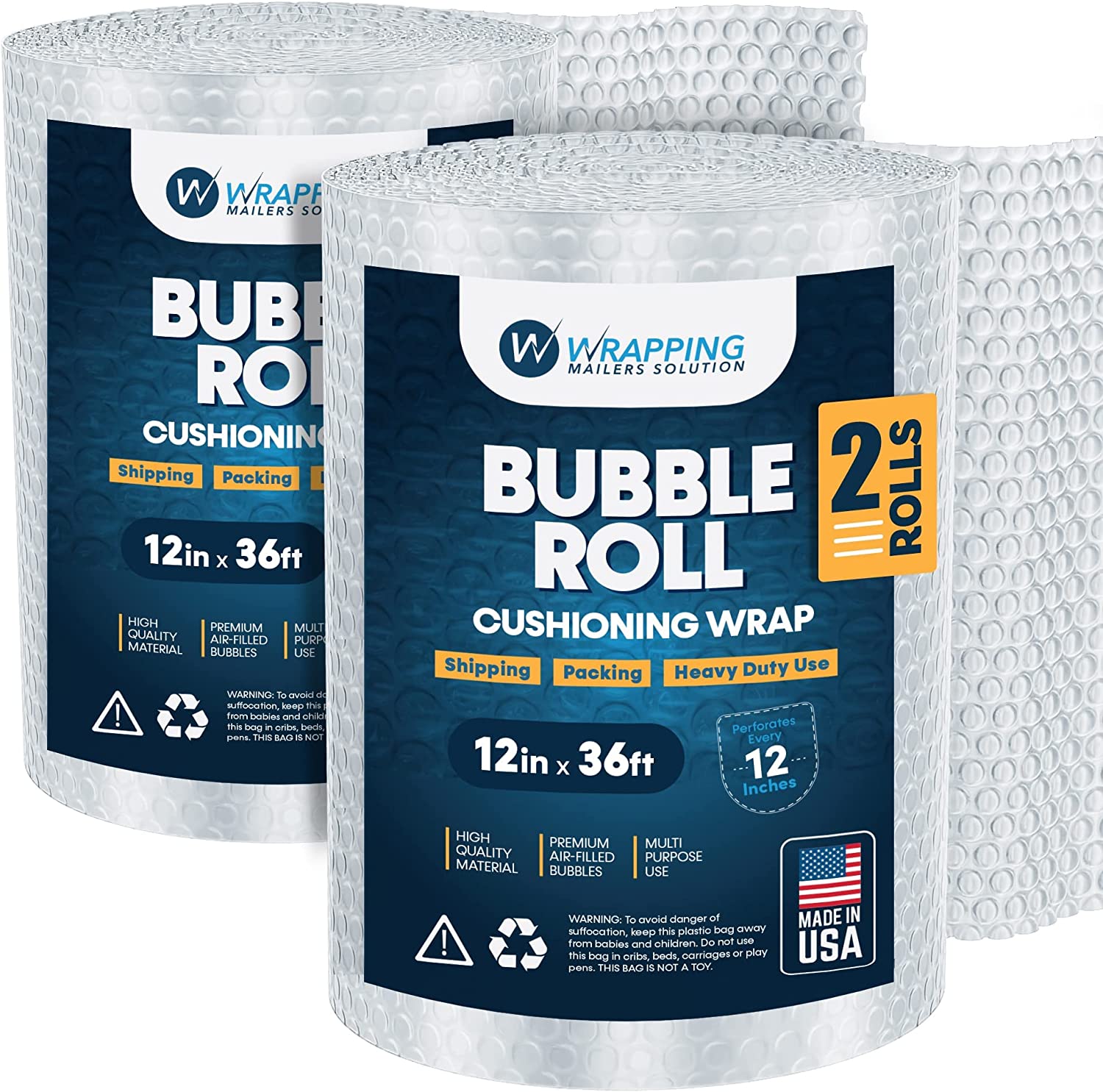 Air Bubble Cushioning Roll Wrap 12-Inches X 36-Feet Perforated Every 12-Inch For Shipping -For Packing and Moving Boxes Heavy Duty, Made In USA-High Quality