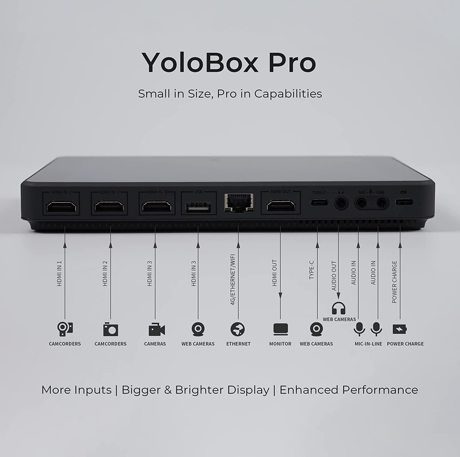 - 【All in One】 YoloBox Pro is a full HD live broadcast device integrating encoder, switcher, monitor and recorder, with built-in battery and native support for 4G LTE, WiFi, Ethernet. Perfect for Worship, Weddings/Funerals, Sport, Events, Corporate, Education, Retail Business and Much More.