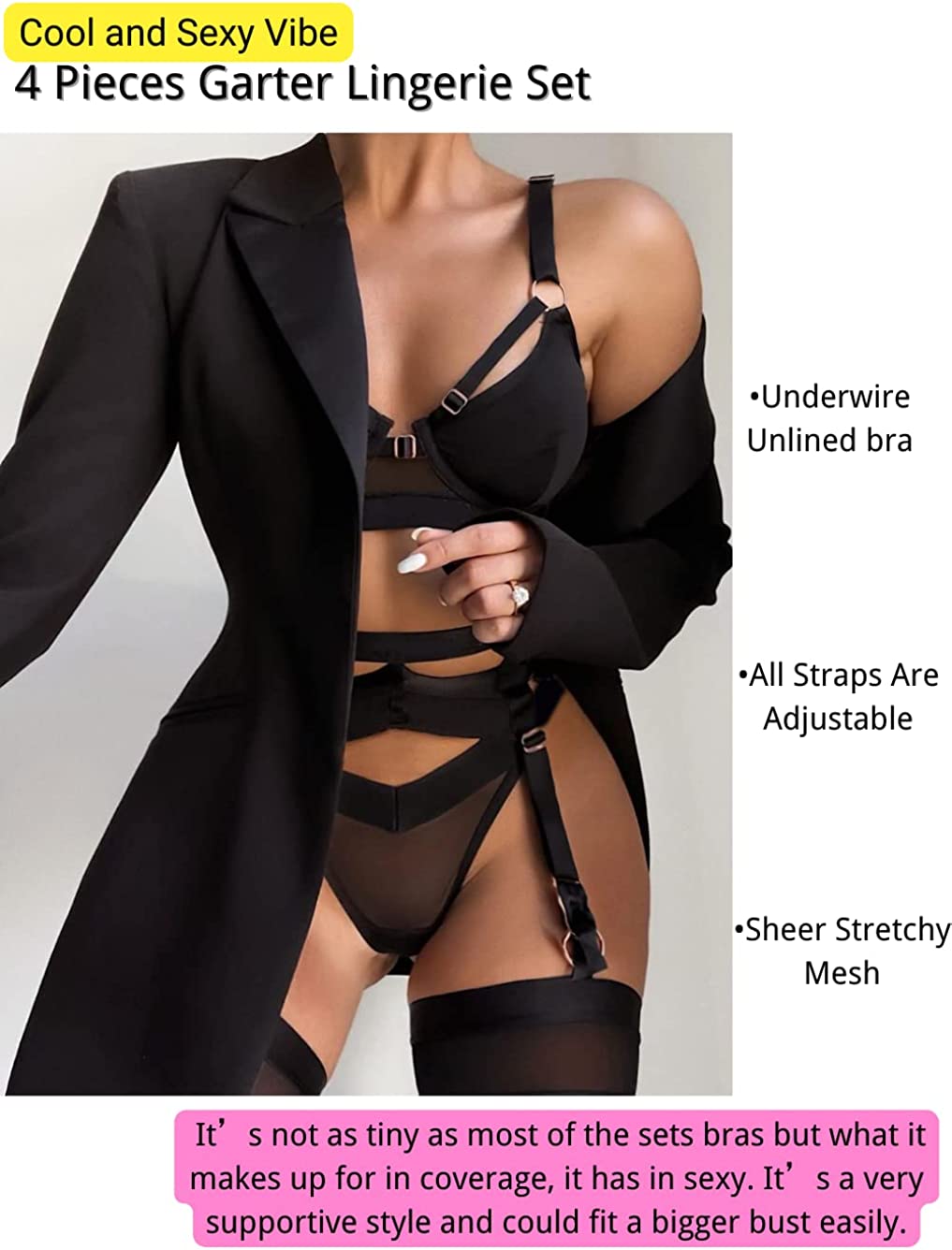 Garter Lingerie for Women,Sexy Lace Lingerie,Sheer Matching 4 Piece Lingerie Set