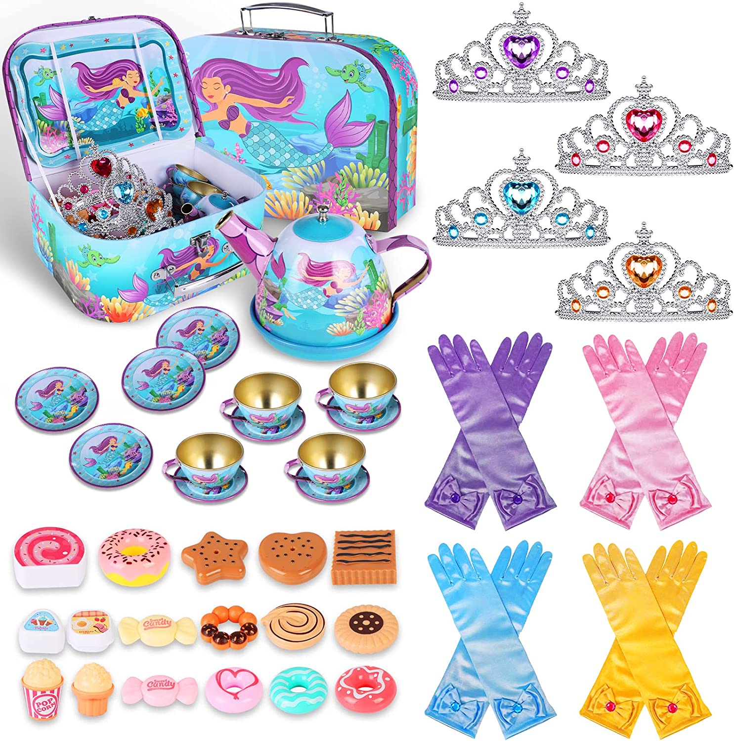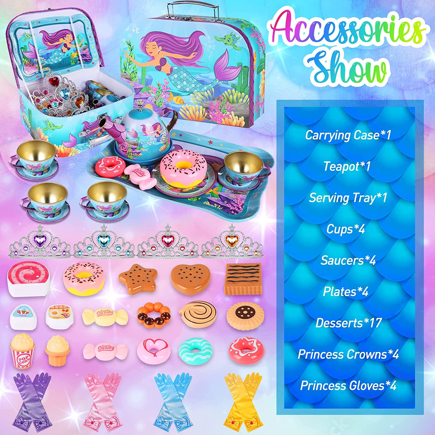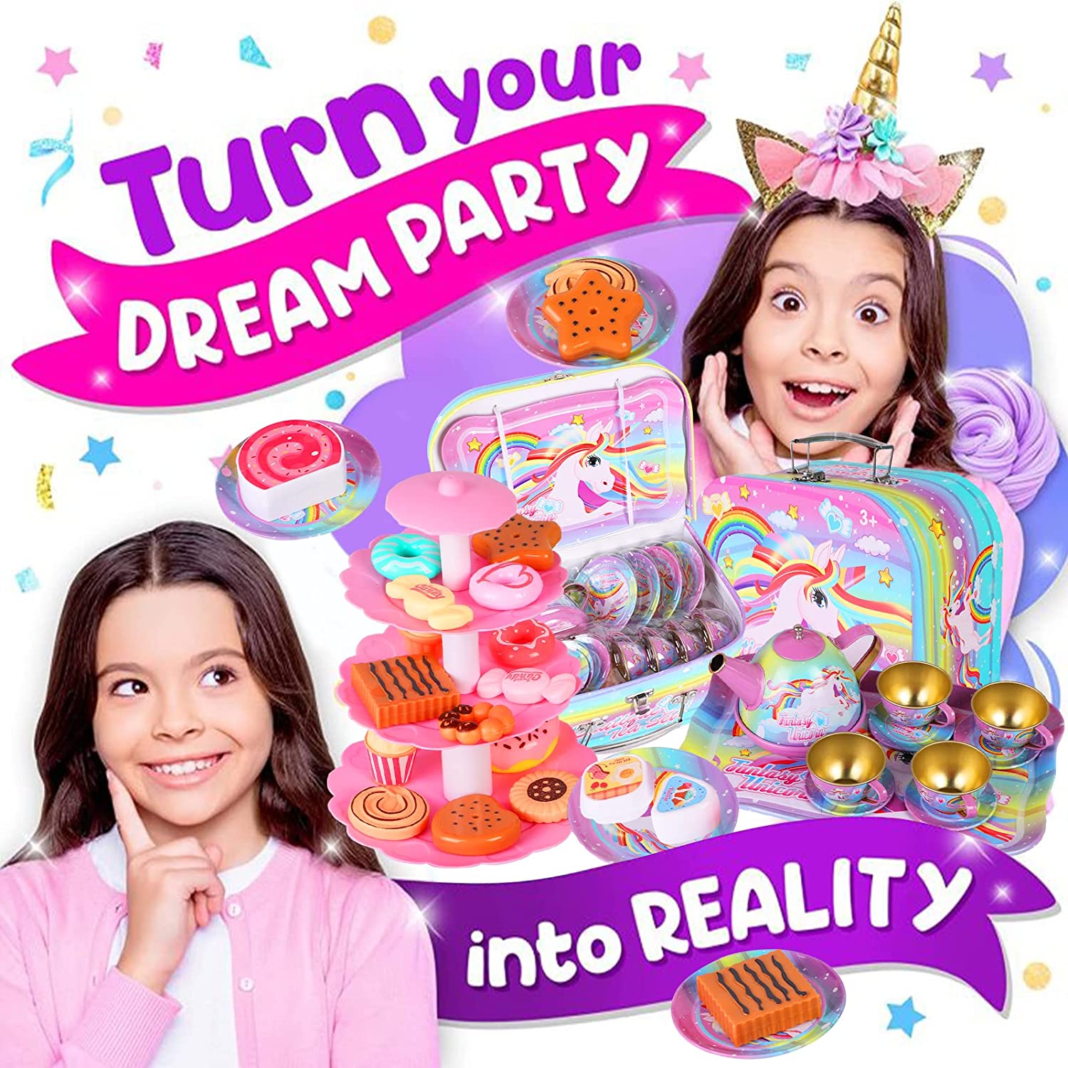 • ?【Gifts suitable for giving away】: MJartoria Unicorn Tea Party Set for Little Girls have a storage box that can store your tea set well. Open the box, you will be able to see a variety of tea sets and dressing pastries, such as 14 tea sets including teapots, cups, plates of various sizes, etc. There are 17 dressing up pastries including donuts, biscuits, etc. We also have a special 3-layered pastry tray, so children can have a good time.