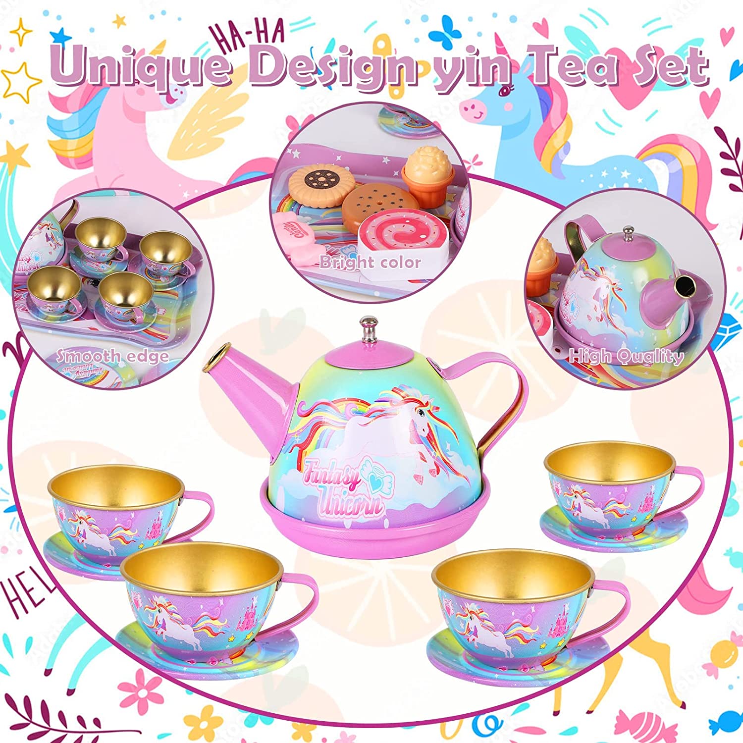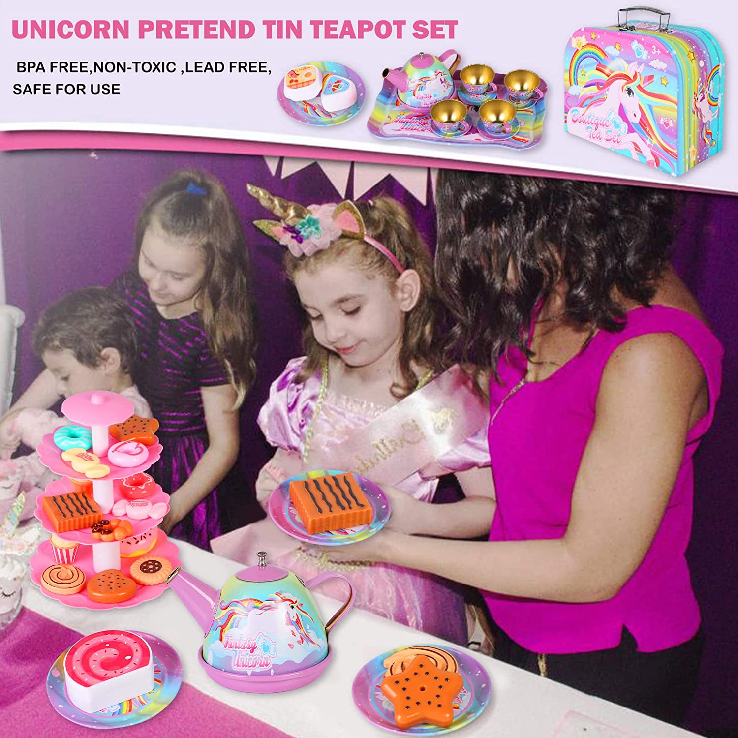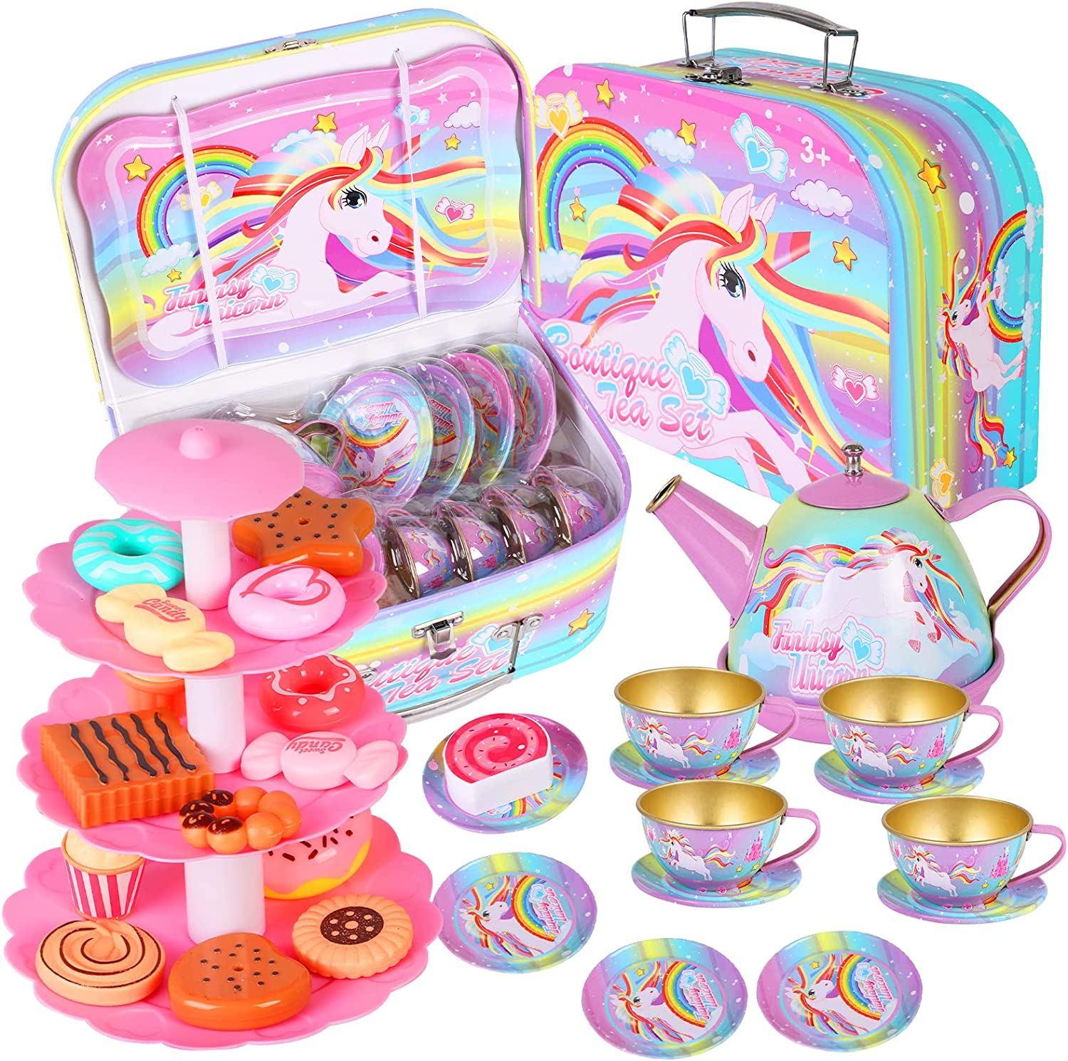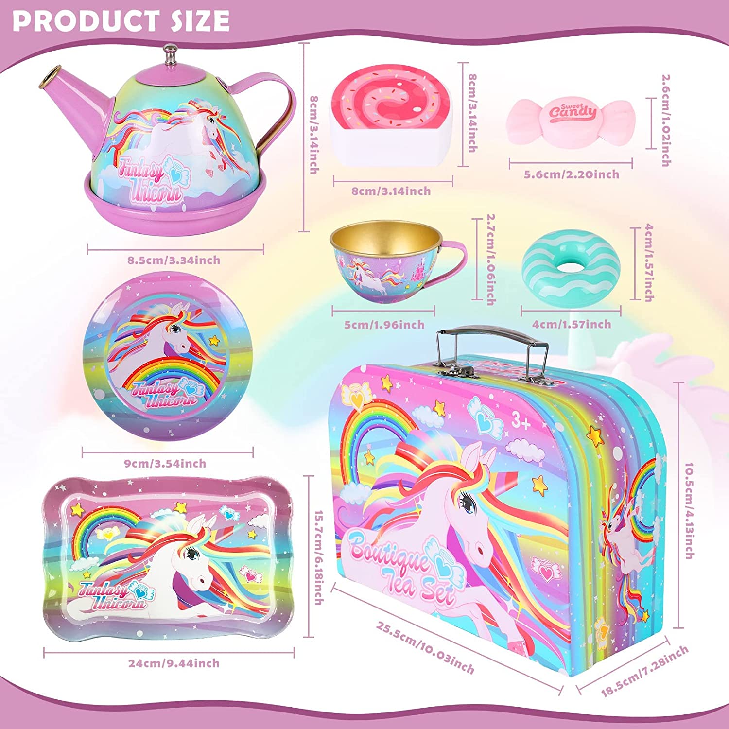 MJartoria Unicorn Tea Party Set for Little Girls Kids Pretend Tin Teapot Set with Carrying Case for Tea Party Princess Tea Time Kitchen Pretend Play Toys Unicorn Gift for Girls