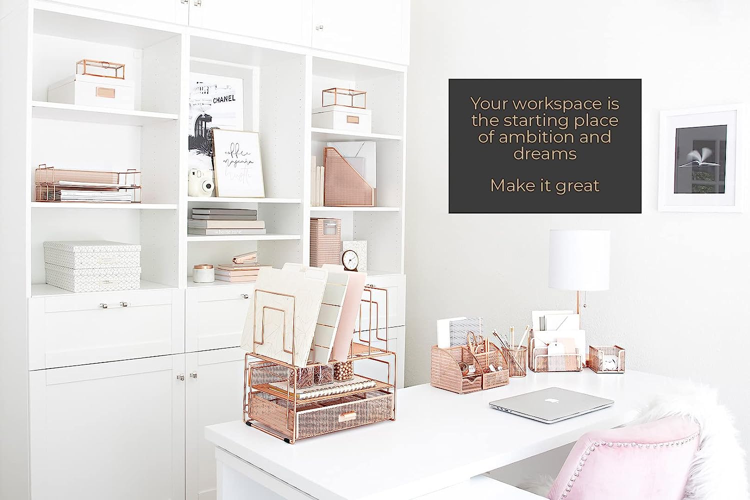 - MODERN, SPACE SAVING DESIGN: Organization does not have to be difficult. Made of metal finished in rose gold and featuring a unique mesh design, this Vertical and Horizontal File and supplies organizer with drawer and letter sorter keeps things organized and saves space.