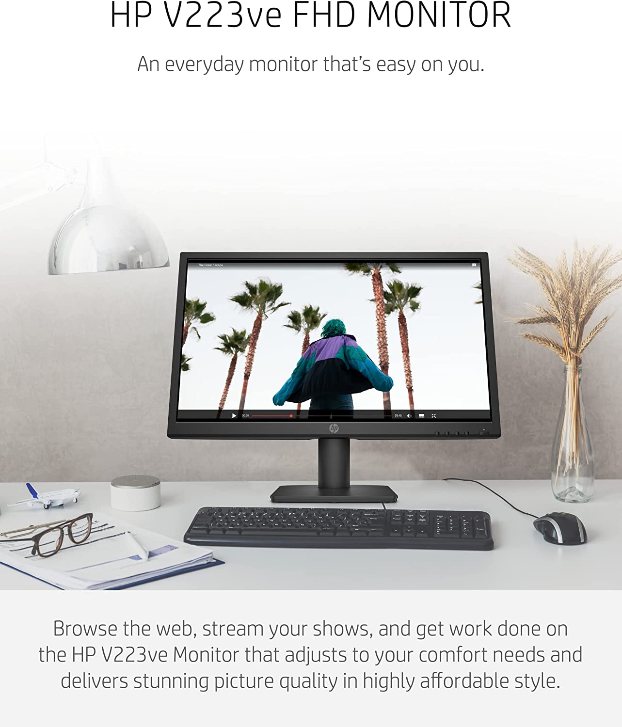 Browse the web, stream your shows, and get work done on the everyday HP V223ve FHD Monitor. This HP computer monitor’s 21.5-inch Full HD screen boasts unparalleled visuals every time you turn it on (1). What’s more is that the 1080p monitor features a 75Hz refresh rate for smoother images, plus a superb contrast ratio for better color differentiation (2). No matter where you view your HP monitor, the VA panel ensures image clarity is maintained across ultra-wide 178-degree horizontal and vertical viewing angles. Easily connect a laptop, an external storage drive, or an additional monitor with the HDMI and VGA ports. Get the most out of a PC monitor designed for both comfort and efficiency. The TÜV certified Low Blue Light Mode limits the strain put on your eyes, while the tilt-adjustable display ensures comfortable posture all day. Beyond this HDMI monitor’s comfort settings, the narrow bezel design keeps things stylish and productive, letting you see more of your favorite show or word document. Customize your display with ease thanks to the intuitive HP Display Center software; through the host PC, you can personalize every little detail from display settings, screen partitioning, and even dimming the screen. Further customize the way you use this monitor with standard 100 x 100 millimeters VESA mounting options (3). This 75Hz monitor’s energy-efficient design isn't just for you but the environment too, as your device reduces power consumption and energy costs. Plus, the materials used in the packaging are 100% sustainably sourced and recyclable (4). Rest easy as your monitor is covered by an HP 1-year limited hardware warranty. (1) Full high-definition (FHD) content is required to view FHD images. (2) During video playback only, depending on series of frames or time duration. (3) Bracket not included. (4) 100% outer box/corrugate cushion packaging made from sustainably sourced certified and recycled fibers. Fiber cushions are made from 100% recycled wood fiber and organic material. Excludes plastic bags and plastic foam sheeting. 06/04/2021_r1 tg.