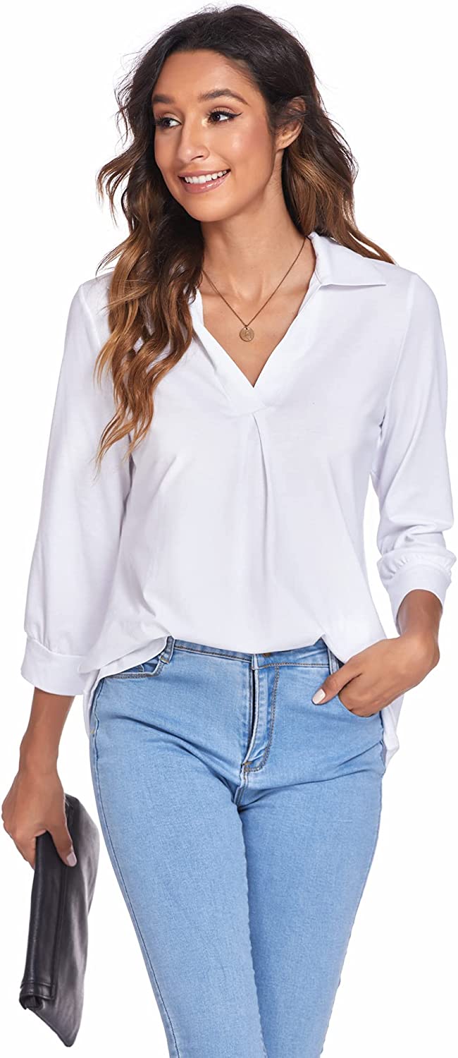 Newchoice Womens Collared V Neck 3/4 Sleeve Shirts Business Casual Tops Loose Work Blouses