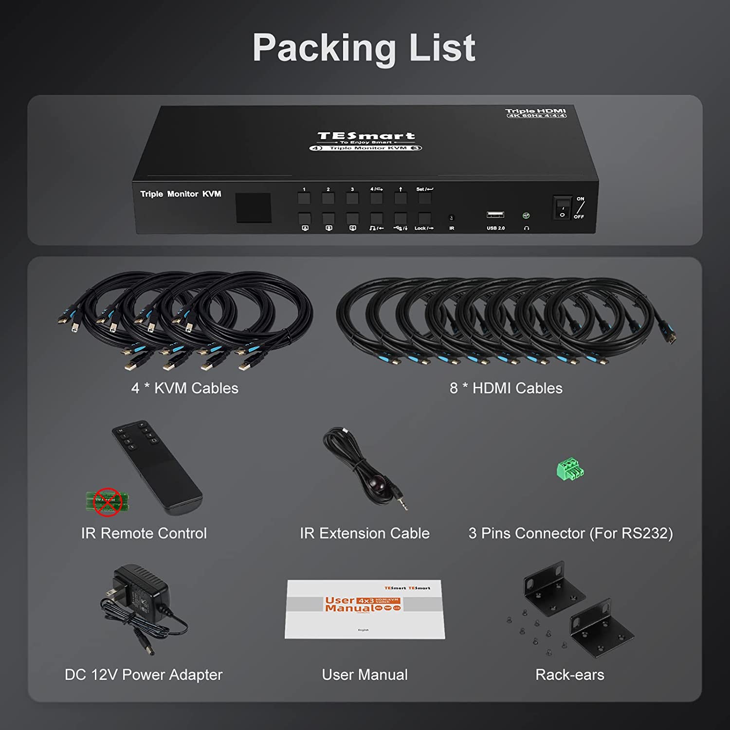 【SUPPORTS SIMULTANEOUS DISPLAY OF MULTI SYSTEMS】TESmart 3 monitor KVM cross supports multiple operation systems, compatible with Unix/Windows/MacOS X/Ubuntu/Debian/Fedora/Raspbian/Ubuntu for Raspberry Pi and other Linux based systems. Plug and play without any software needed. This unit is the best KVM switch choice for IT professionals who tend to work with multiple systems at any given time.