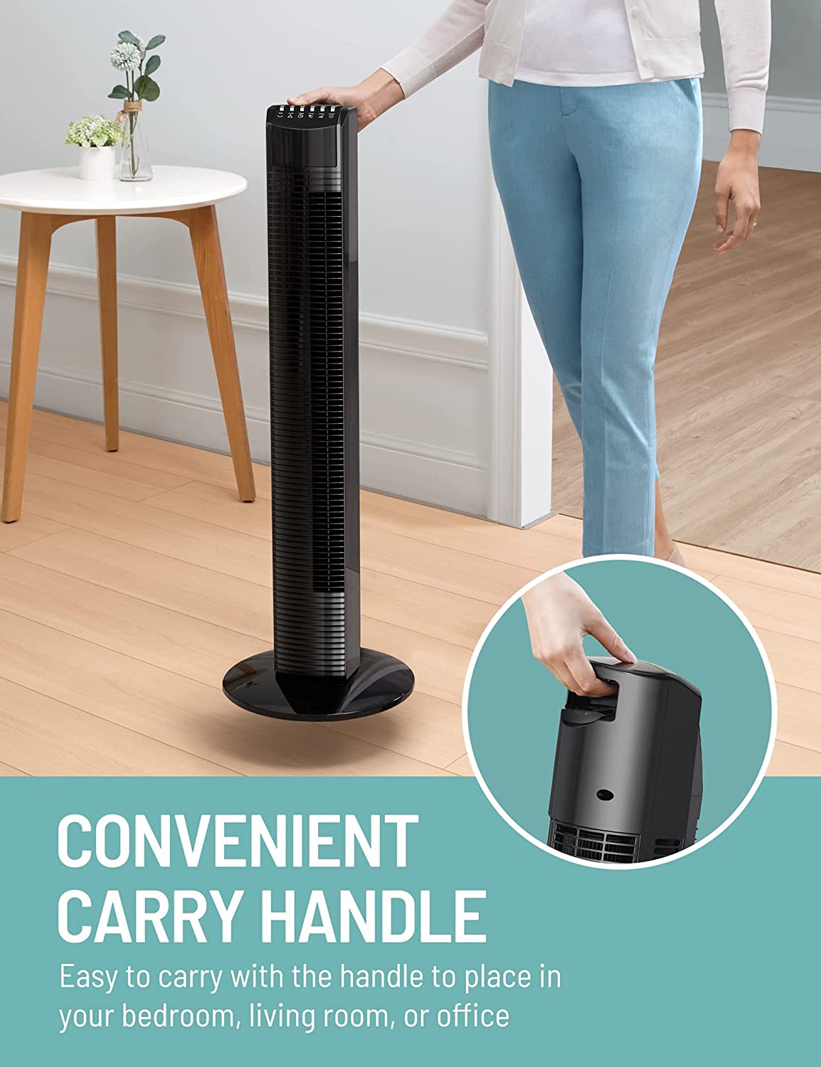 - Compact & Portable: The tower fan can fit into any room corner thanks to the small base and body; move it easily with the convenient carry handle