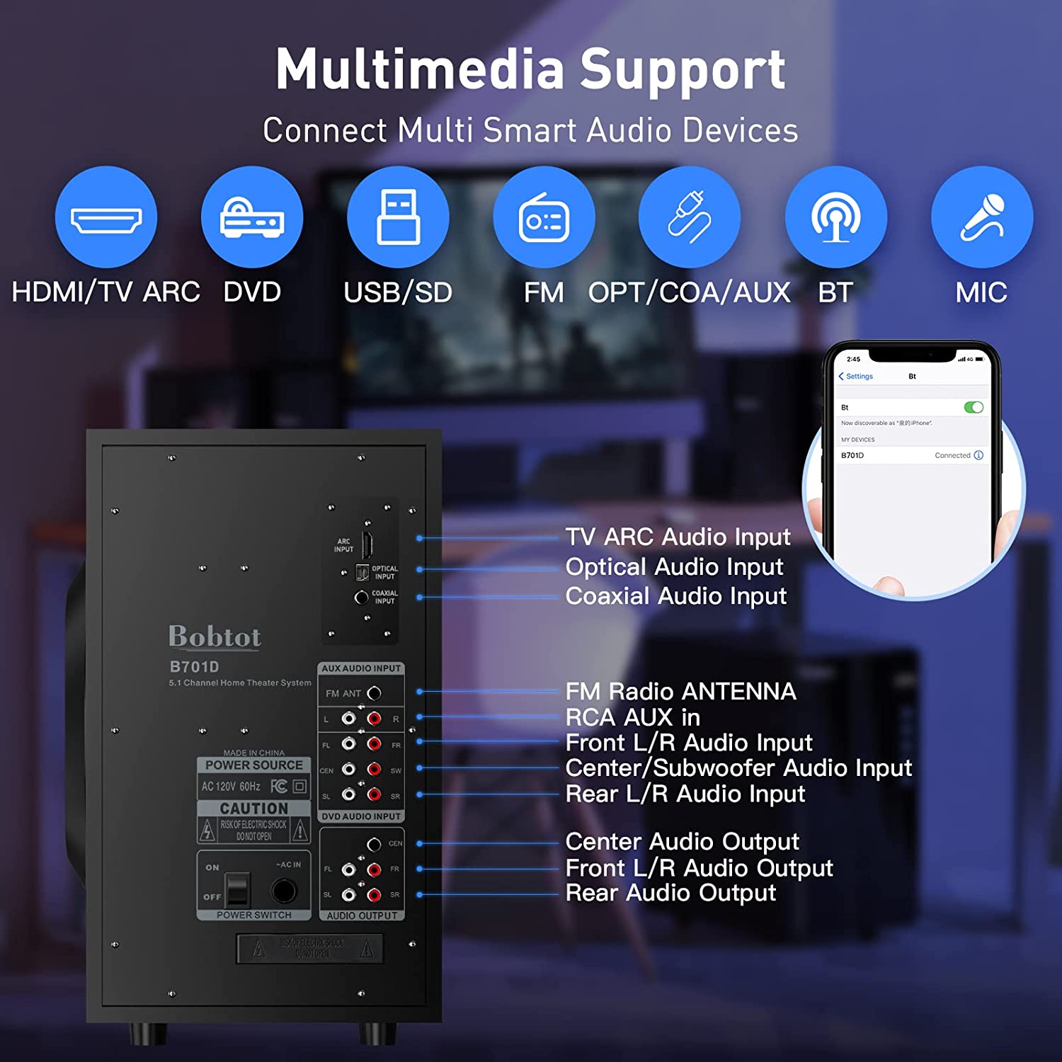 - Multimedia Support: 5.0 Bluetooth speakers can connect to various smart devices, and support multiple input modes like TV ARC/OPT/COA/AUX/USB/DVD, Additional cables include HDMI ARC cable/Optical cable/Coaxial cable/RCA cable/Antenna cable/Aux cable that can support any application in need