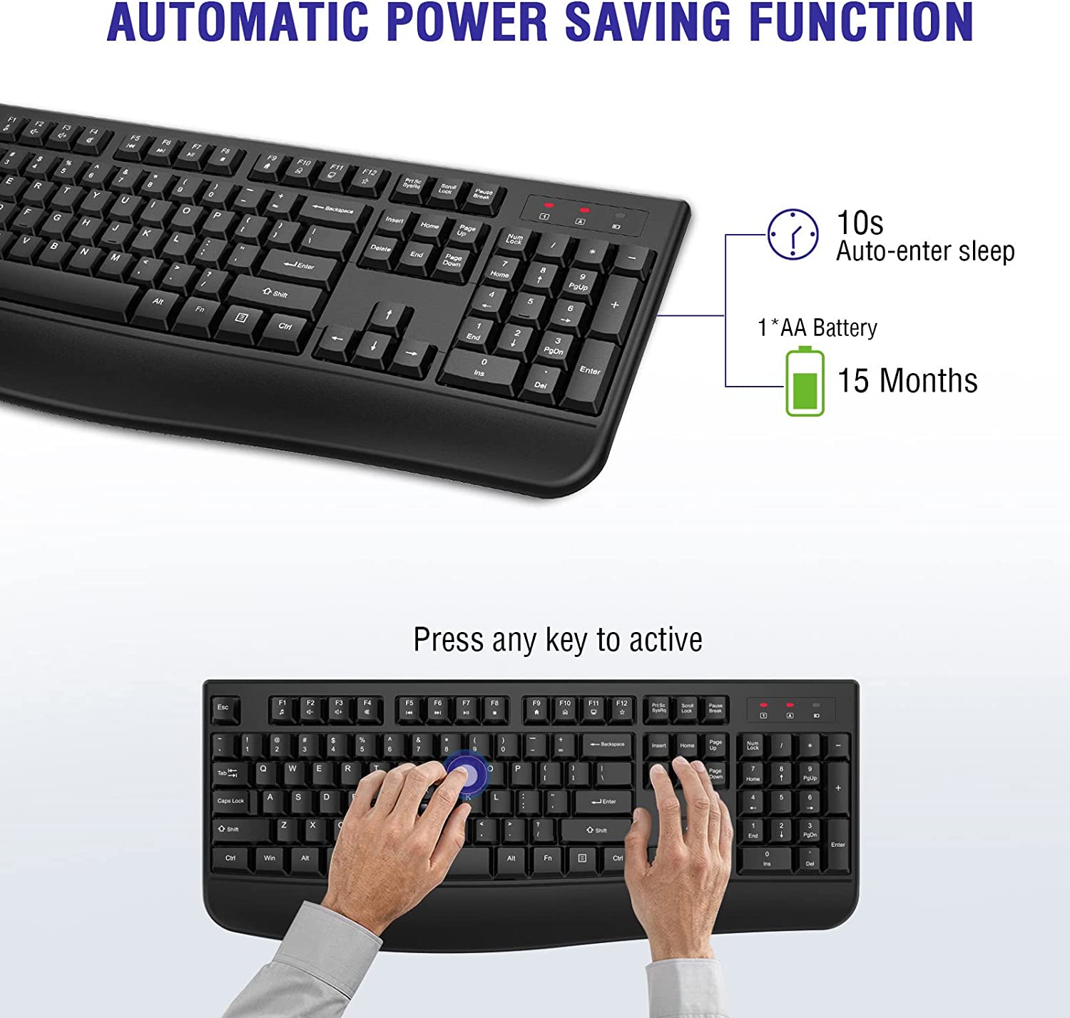【SMART POWER SAVING FUNCTION】This wireless keyboard has auto-enter power saving function. When you stop using the keyboard more than 30 minutes, it will enter sleep mode respectively to save power. This feature greatly extends the battery life, you can click any button to activity the device. The keyboard need 1 x AA battery. (Battery Not Included)