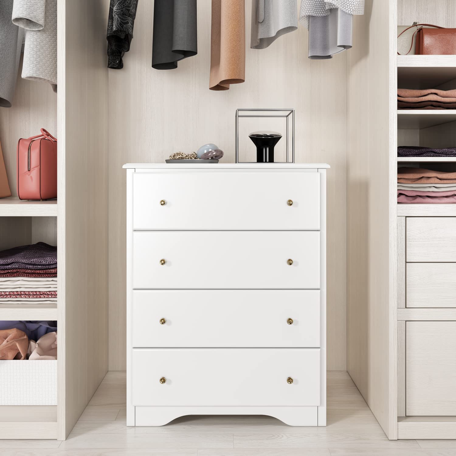HOUSUIT Dresser with 4 Drawers, Modern Dressers for Bedroom, Chest of Drawers Clothes Organizer, Wooden Nightstand for Living Room, Closet, Hallway, White