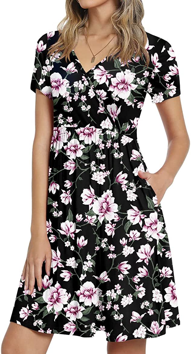 CATHY Womens Casual Tunic Dress Short Sleeve V Neck Dresses Loose Comfy Beach Sundress with Pockets