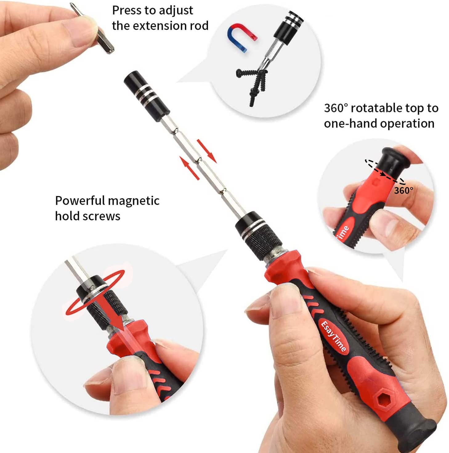 【Ergonomic Design】This electronic screwdriver set has an ergonomic press-type design handle to maximize your repair efficiency. The handle is wrapped with soft granular rubber, which is stable and non-slip. The tail of the handle can be rotated 360° and can be operated with one hand. Equipped with an adjustable 5-section extension rod that can be adjusted from 3cm to 11.5cm. The flexible shaft can be bent 180° and rotated 360°, which is convenient to remove screws at the corners.