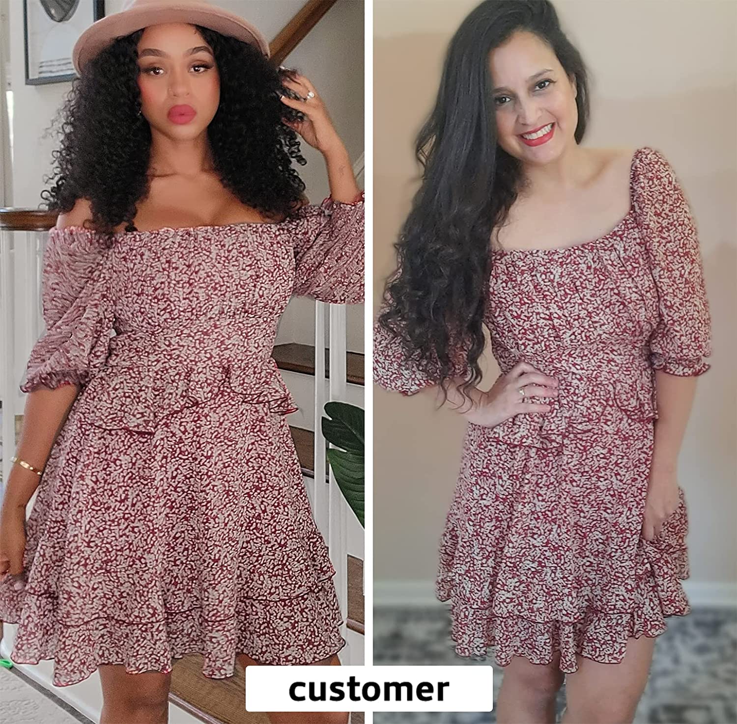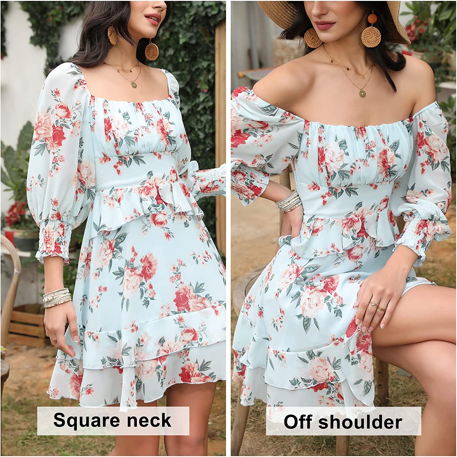 • Design: 2022 summer dress for women, square neck, off shoulder, ruffle hem, 3/4 puff sleeve, mini length, tiered design, lining, floral print dress, smocked design, open back, frill hem, ruched bust, high waist, a-line silhouette.