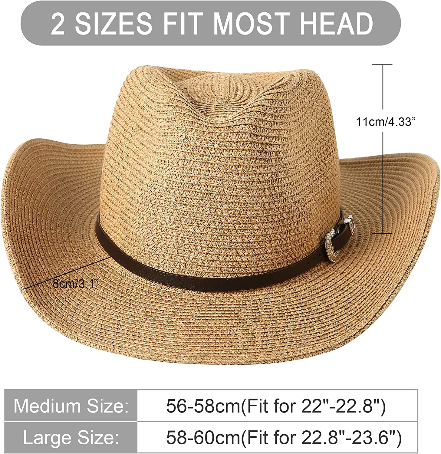 • Lightweight and breathable: This cowboy hat has 2 sizes ,fit most lady women,Hat Circumference: Medium:56-58cm/22-22.8"; Large:58-60cm/22.8-23.6"Brim Width: 8cm/3.1"; Hat Height: 11cm/4.33";. Made with premium quality materials for durability and long-lasting use. Offers excellent UV protection for outdoor activities. Available in various colors and sizes.