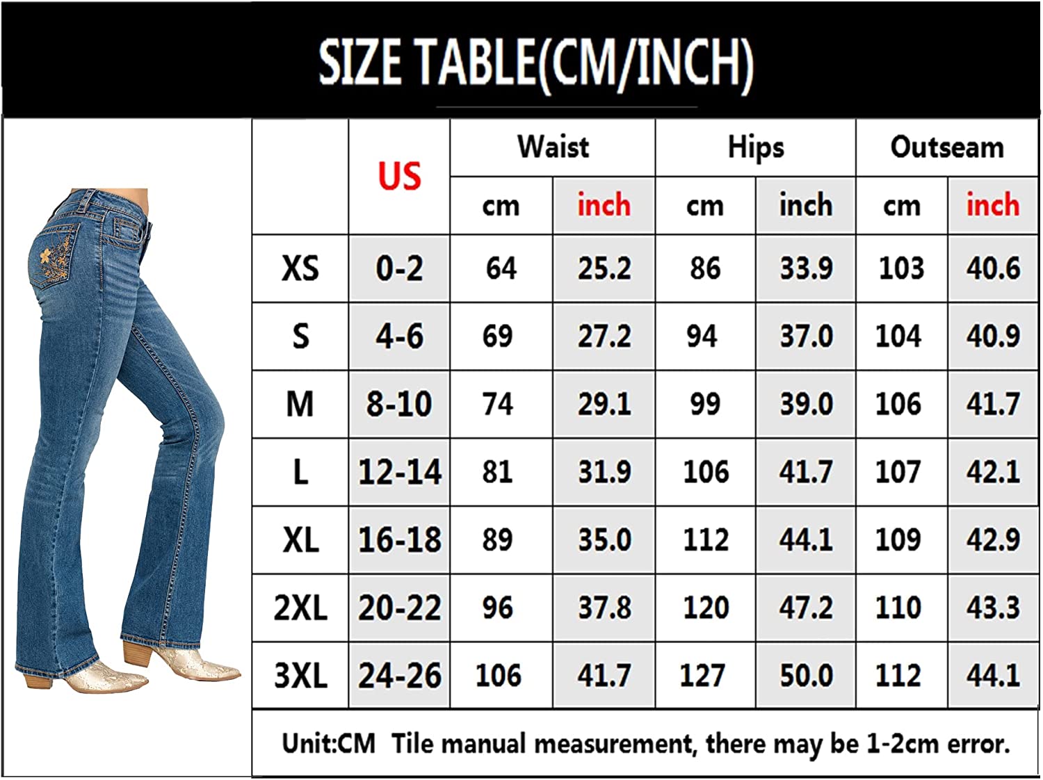 • [Features]: Zipper button closure, bootcut jeans, stylish slim jeans with embroidery bell bottom jeans, mid-waist bootcut jeans.