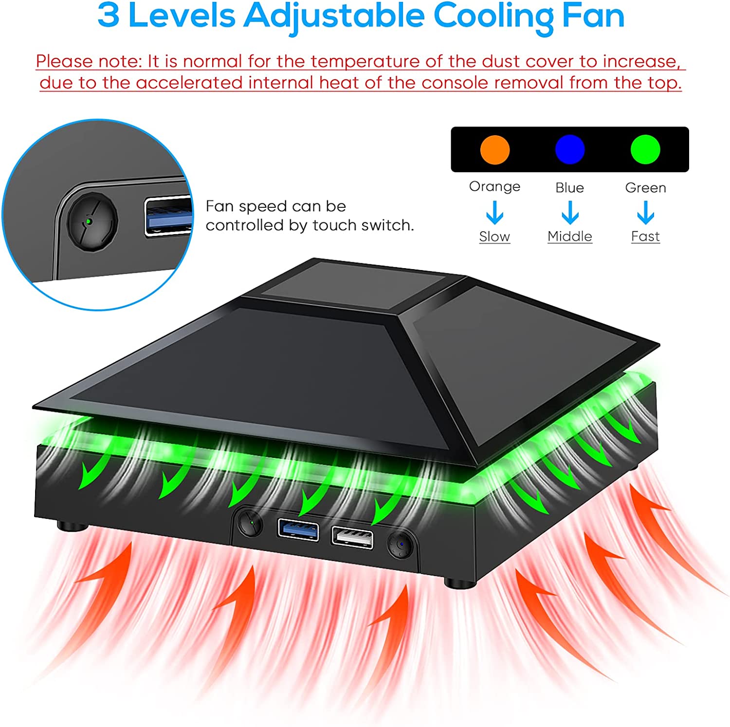 【Efficient Fan System】---- A high-speed large fan are built in the colorful dust-proof cooling fan,which can accelerate the hot air exhausted from the top of the console and reduce the temperature of Xbox series X console. The cooling fan stand with 3 gears and is a touch switch. The low gear is orange, the second gear is blue, and the high gear is green.The heat dissipation effect is more obvious, and the noise is very low, which you can hardly feel.