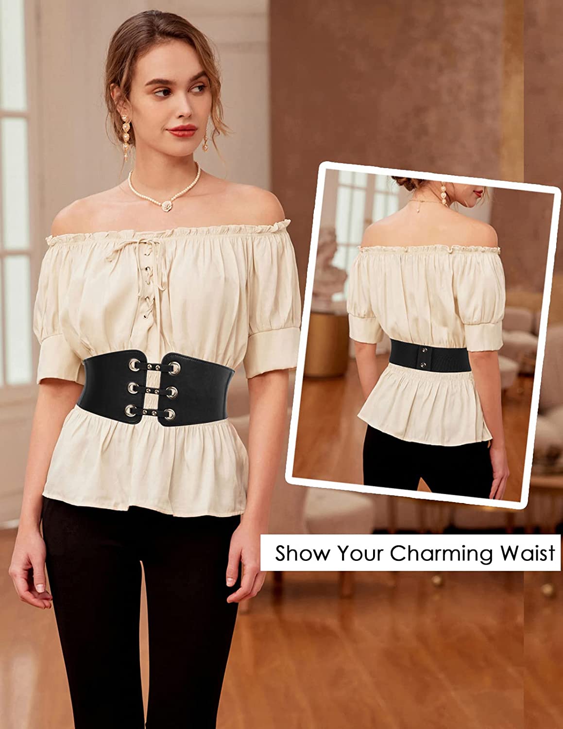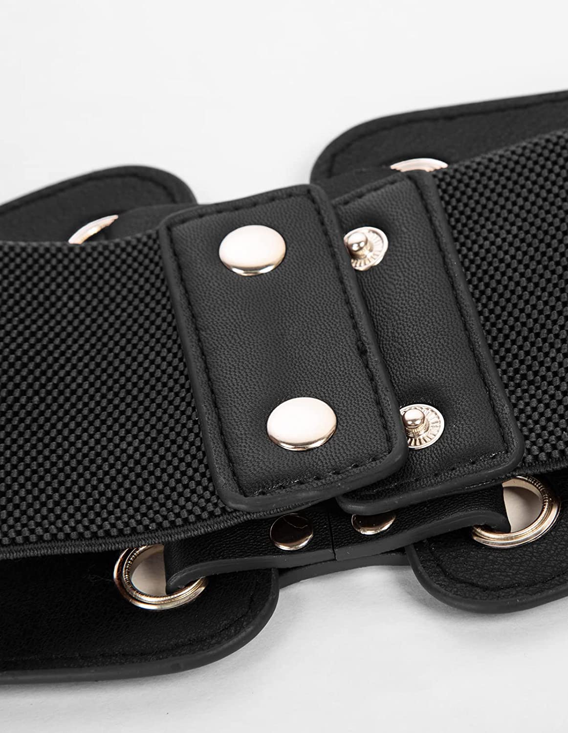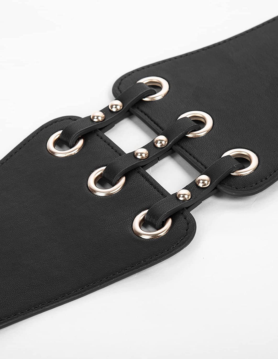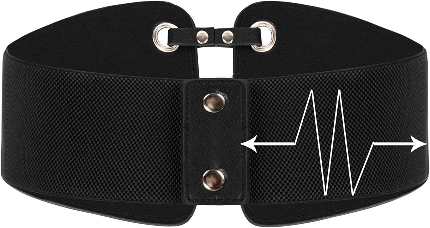 • The elastic cinch waistband is made from strong elastic. It's allowing the belt to stretch comfortably around your waist. Classic vintage design leather rivets connect corset belt, high-quality PU leather belt with well elastic wide band