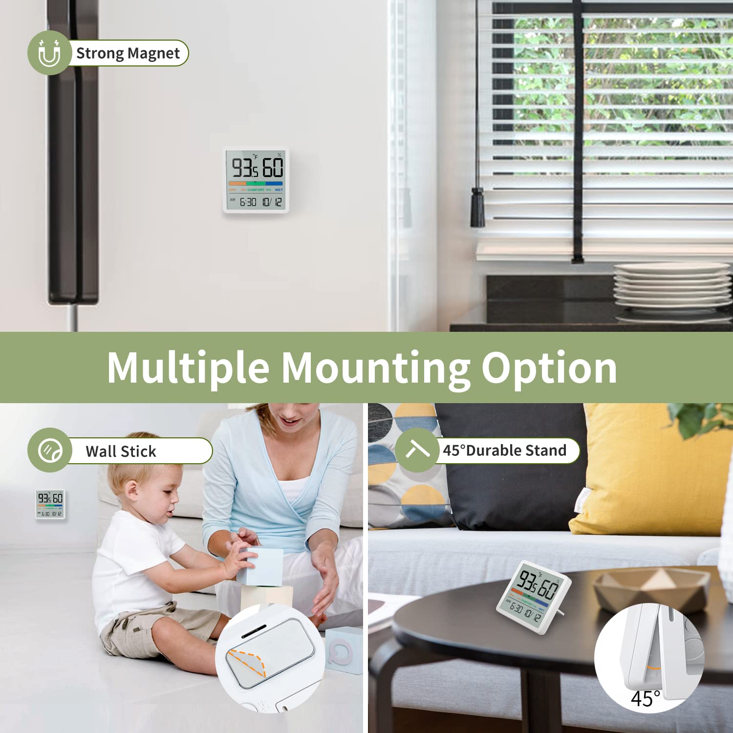 NOKLEAD Indoor Thermometer Hygrometer: Room Temperature Gauge Humidity Monitor for Home, Magnetic, Kickstand, 3.3in Screen, Air Comfort Indicator, Time, Date (Spare Battery Included) - White