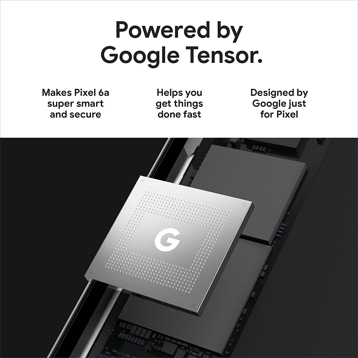 Meet Pixel 6a, the more affordable Google phone that adapts to you.[8] Powered by Google Tensor, it’s super fast and secure, with an amazing battery and camera. And it’s an unlocked Android smartphone, so you can choose the data plan and carrier that work for you.[1] LEGAL [1]Works with all major carriers. 5G service is carrier dependent. Requires a 5G data plan (sold separately). 5G service not available on all carrier networks or in all areas. Contact carrier for details. 5G service, speed and performance depend on many factors, including carrier network capabilities and signal strength. Actual results may vary. Some features not available in all areas. Data rates may apply. See g.co/pixel/networkinfo for info. [2]Estimated battery life based on testing using a median Pixel user battery usage profile across a mix of talk, data, standby, and use of other features. Average battery life during testing was approximately 29 hours. Battery life depends upon many factors and usage of certain features will decrease battery life. Battery testing conducted in California in early 2022 on pre-production hardware and software, using default settings. Battery testing conducted using Sub-6 GHz non-standalone 5G (ENDC) connectivity. Actual battery life may be lower. [3]Requires Google Photos app. Magic Eraser may not work on all image elements. [4]Wired charging rates up to 18W based on use of Google 30W USB-C® or Google 18W USB-C® Charger plugged into a wall outlet. Actual results may be slower. Adapters sold separately. Compatible with USB PD 3.0 PPS adapters. [5]Not available in all languages or countries. Not available on all media or apps. See g.co/pixel/livetranslate for more information. Translation may not be instantaneous. 3Your Pixel will receive feature drops during the applicable Android update and support periods for the phone. See g.co/pixel/updates for details. [6]Internet connection required during setup only. [7]Designed to comply with dust and water protection rating IP67 under IEC standard 60529 when each device leaves the factory but the device is not water or dust proof. The accessories are not water or dust resistant. Water resistance and dust resistance are not permanent conditions and will diminish or be lost over time due to normal wear and tear, device repair, disassembly or damage. Dropping your device may result in loss of water/dust resistance. Liquid damage voids the warranty. See g.co/pixel/water for details. [8]Compared to Pixel 5a. [9]Deblurring may not work on all photos or videos with faces. [10]Some third party apps and data may not be transferred automatically. Visit g.co/pixel/copydatahelp for information. [11]Measured diagonally; dimension may vary by configuration and manufacturing process. Smooth Display is not available for all apps or content. Smooth Display automatically adjusts to optimize for best viewing and battery performance. [12]Measured diagonally; dimension may vary by configuration and manufacturing process. [13]Maximum resolution and field of view with RAW image files setting turned on. Setting is turned off by default. See g.co/pixel/photoediting for more information. [14]Storage specifications refer to capacity before formatting. Actual formatted capacity will be less. [15]Your Pixel will receive feature drops during the applicable Android update and support periods for the phone. See g.co/pixel/updates for details. [16]Compared to MSRP of Pixel 6. [17]See g.co/pixel/astrophotography for details.