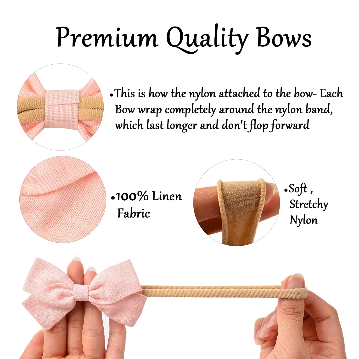 【100% Linen Fabric】: These baby bows on nylon headband are lovingly designed and handmade using natural linen fabrics.Jesries Each bow is handcrafted with care and professions. The material is gentle and soft which is safe to use on your baby’s head.
