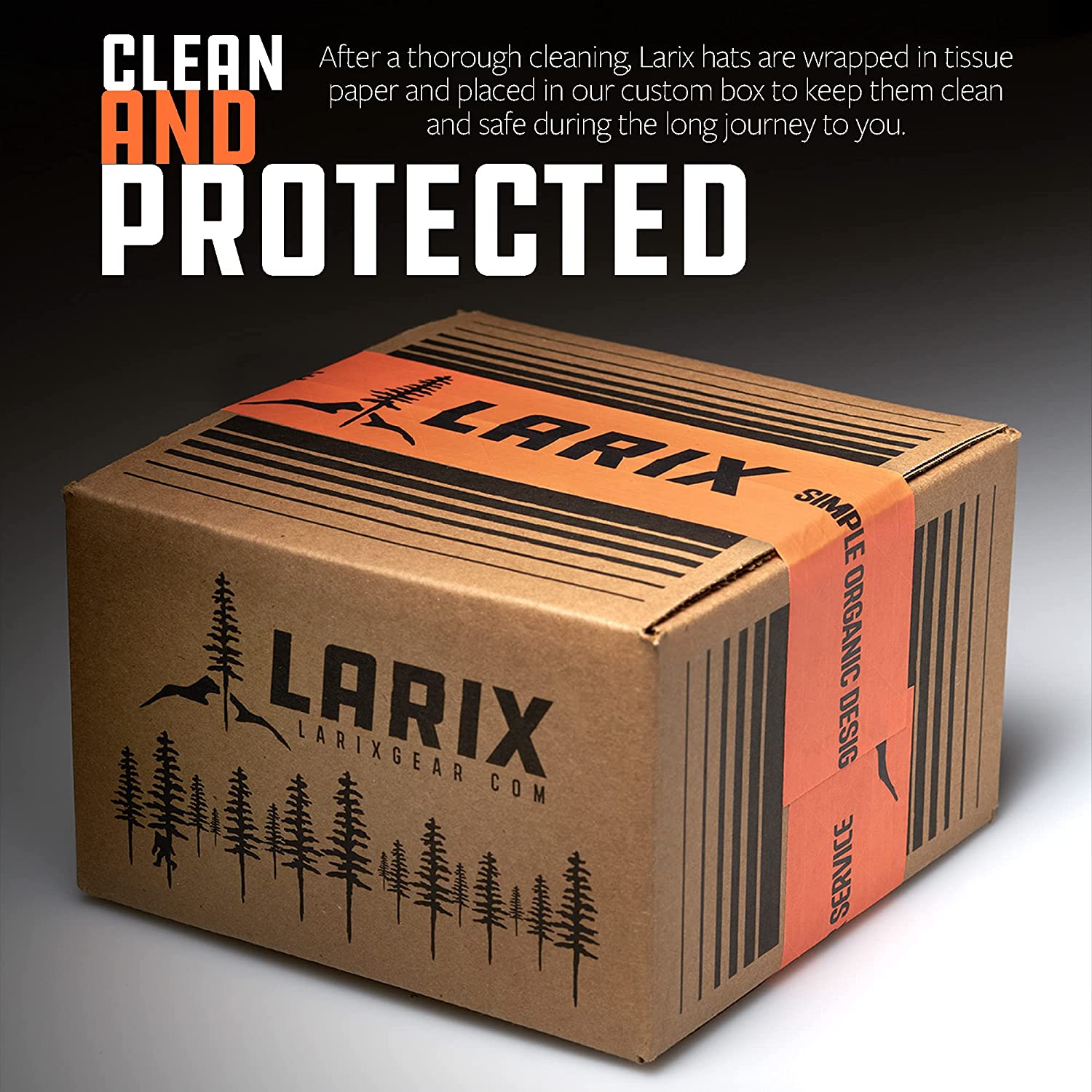 • SHIPPED IN BOX : After your hat has been cleaned and prepped we wrap your Larix hat in tissue paper before placing it in our custom box to keep it clean and safe during its long journey to you. IF YOUR HAT DOESN'T ARRIVE IN A BOX PLEASE REACH OUT TO US DIRECTLY TO LET US KNOW. You will immediately understand the level of care and craftsmanship put into your Larix hat upon receiving and opening your box.