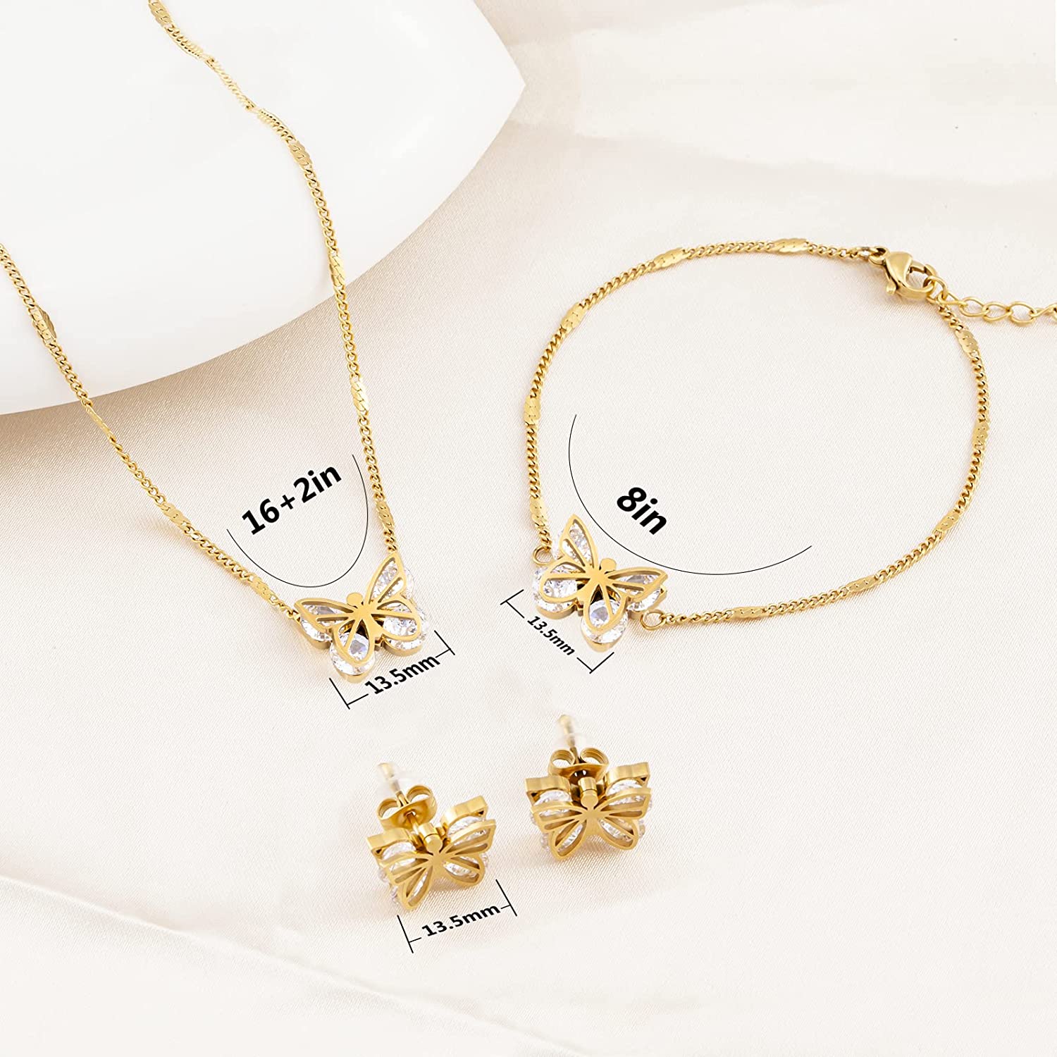 ✦ Size: Necklace length is 18+2in, bracelet ength is 6.7+1.2in, chain size can be adjusted, earrings diameter size is 0.67in, Butterfly pendant necklace bracelet earrings are regular size, suitable for most people.