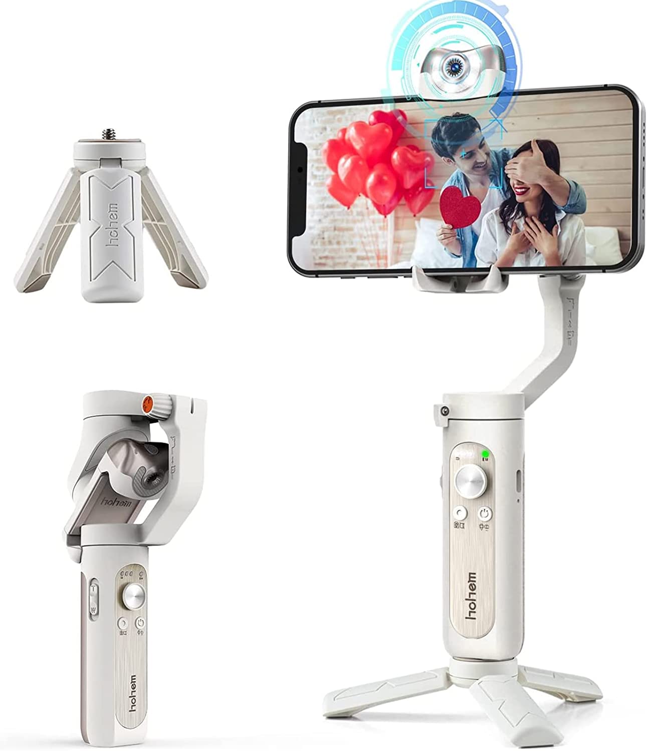 Hohem iSteady V2 Gimbal Stabilizer for Smartphone AI Visual Tracking LED Video Light Auto Zoom Foldable 3-Axis Gimbal for iPhone13/12 Pro Max,for Samsung S20 for YouTube TikTok Live Video (White)