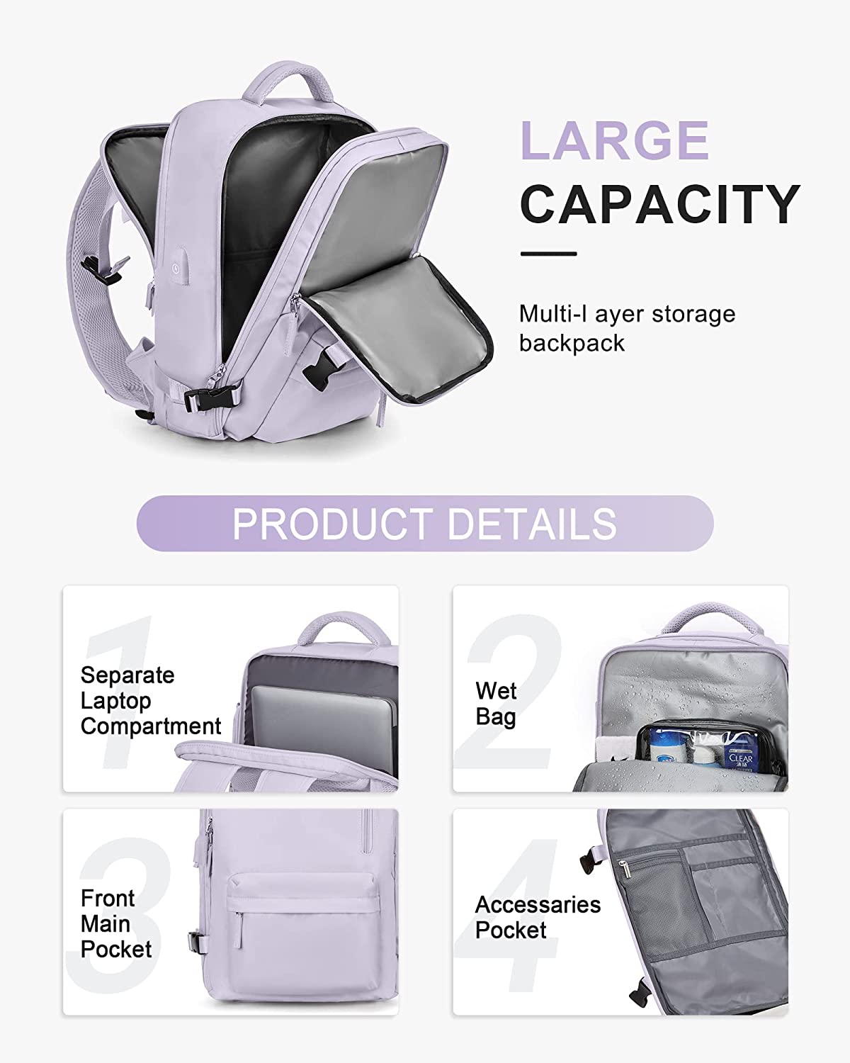 Large Capacity Travel Backpack: Two main pockets for women's personal items,clothes and more; keep your items organized and easier to find. Two laptop compartments for a 13-inch ipad and a 15.6-inch laptop.the casual backpack is also designed with a waterproof wet bag and a separate shoe compartment, the wet bag is made of high-density waterproof material to help you separate wet and dry items, and the separate shoe compartment can help you better carry your shoes