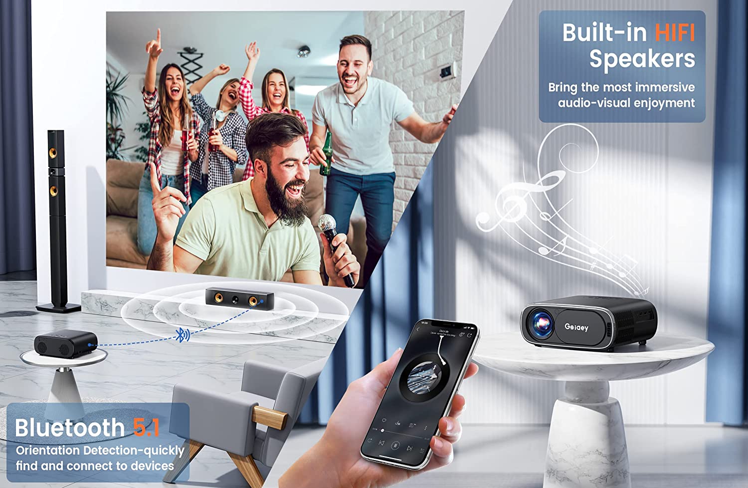 ♫【5.1 Bidirectional Bluetooth & HIFI Audio & Unique Wallpaper】 The projector newest chip with "orientation detection" allows quick search and connection with your device while reducing interference from others. Built-in HIFI speaker with DSP tech, it's both a smart projector and an independent Bluetooth speaker. You can enjoy clearer and more realistic sounds. Variety of themes for you to choose from and you can also set your favorite picture as wallpaper to create a unique movie projector!