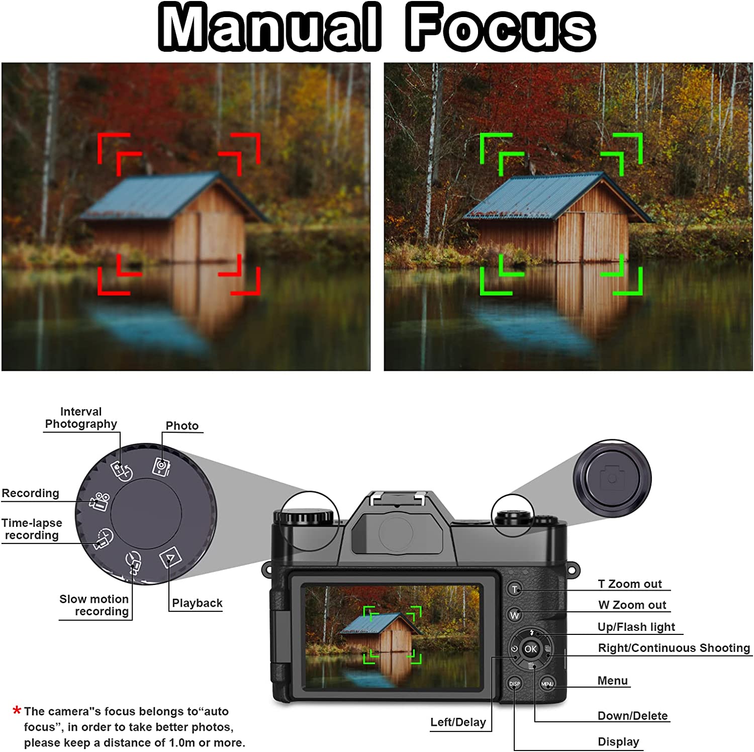 - ?【Digital Camera with Wide Angle Lens & Macro Lens】The 4K camera equipped the camera with a professional detachable 52mm wide angle lens with macro lens, so the camera is great for capturing wide horizons easily, and macro lenses capture the diversity of the tiny world. Sharp 4K photos can be ruled out with manual focus. With a knob on the top of the camera, you can switch between photos, video, time-lapse photography and other features.