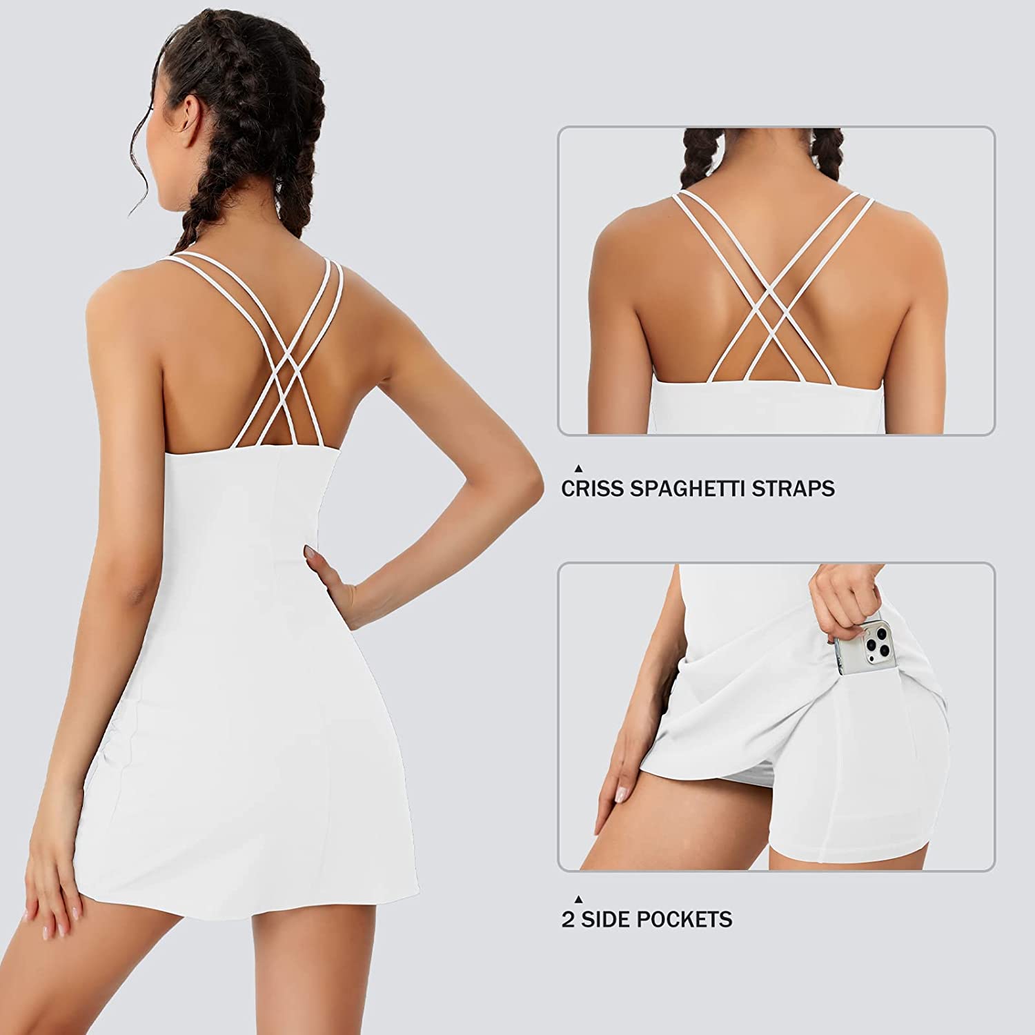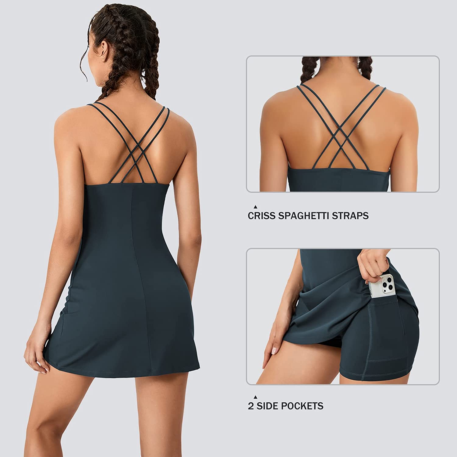 • Crisscross Back Strap: These sleeveless activewear dresses designed with sexy criss cross spaghetti strap, offer trendy charming looks, both side shoulder straps are comfy, elastic, firm and not easy fall apart.