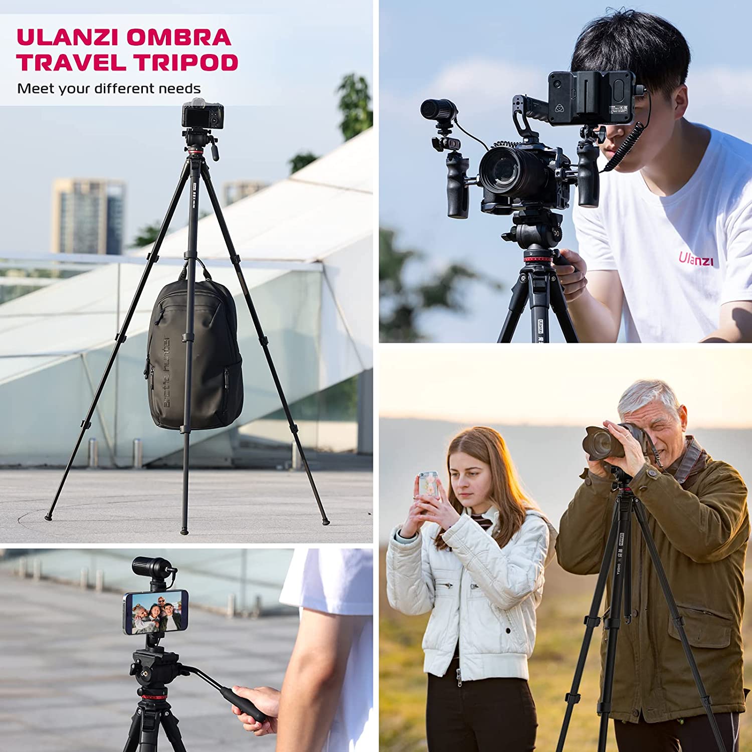 ULANZI MT-56 Ombra Video Travel Tripod, 63" Professional Camera Tripod with Fluid Pan-tilt Head, Aluminum DSLR Tripod Max Load 13.2 LB for Nikon Canon DSLR Camcorder, Phone Holder Included