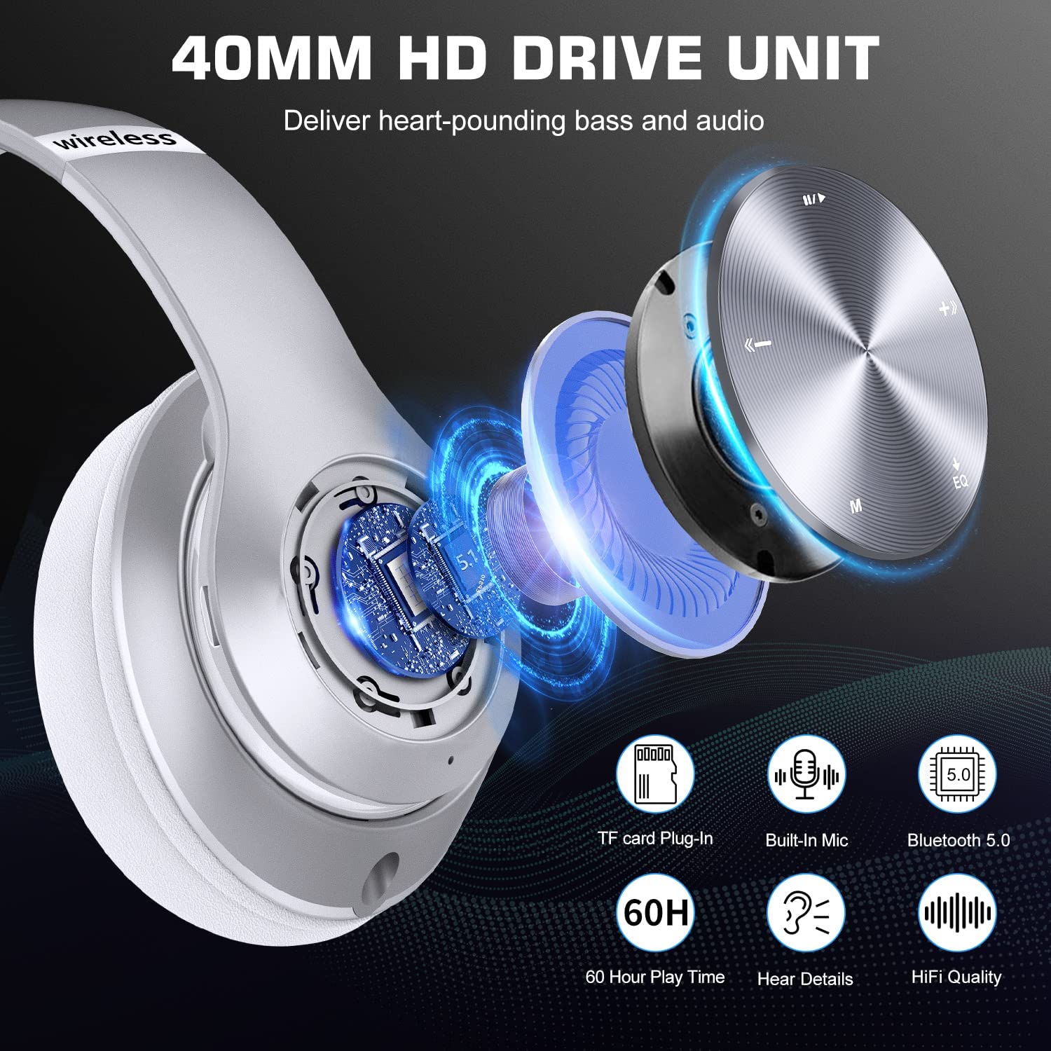 Wireless Bluetooth Headphones Over-Ear, 60H Playtime Foldable Lightweight and Wired Stereo Deep Bass Headset HiFi Stereo Sound with 6 EQ Modes, Micro SD/TF, FM, for Travel Work Laptop PC Cellphone