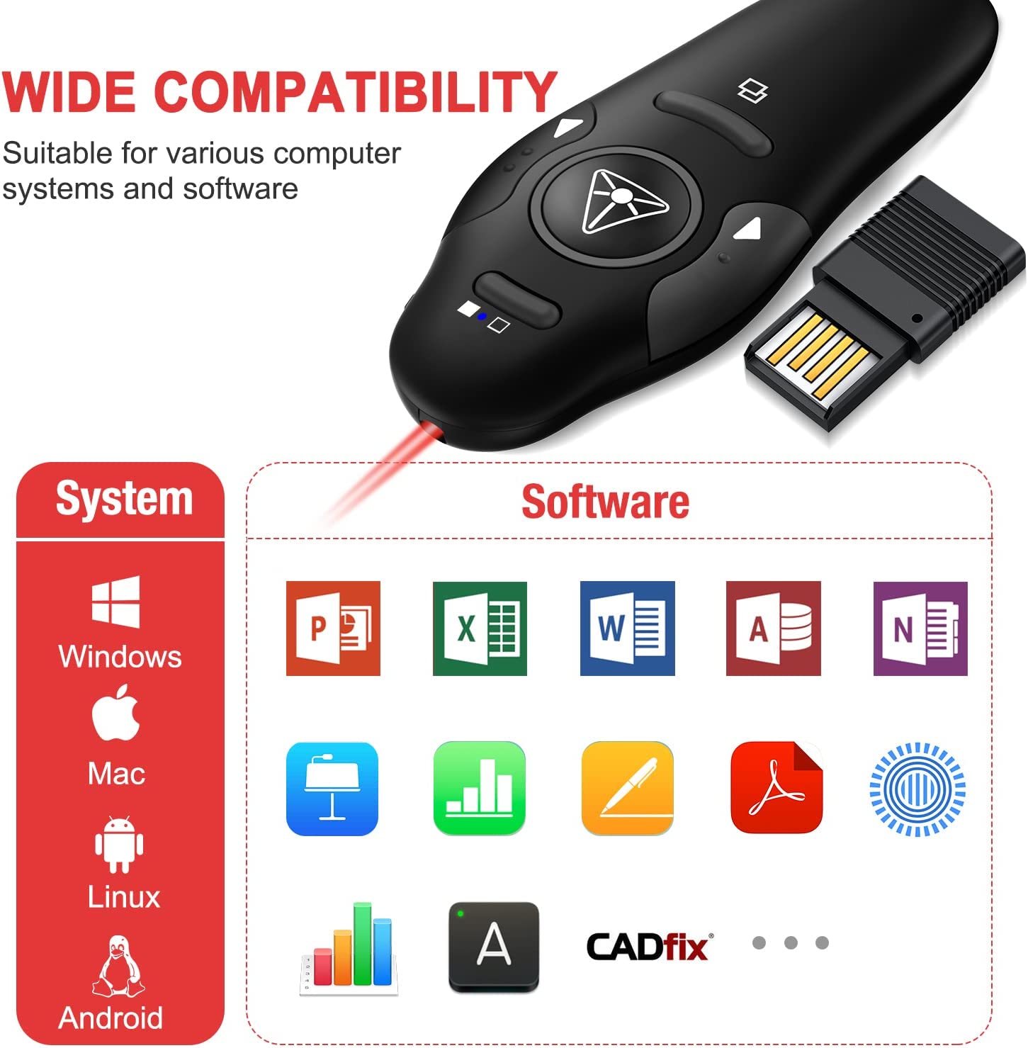【WIDELY COMPATIBLE LASER POINTER FOR PRESENTATIONS】 USB plug and play, no software installation. Clicker support systems for laptop presentations: Windows 2003 / Vista/XP/ 7/8/10, Linux, Mac, Android; Supported software: Word, Excel, PowerPoint, Google Slides, Keynote, Prezi, PDF, Word, ACD Seel, Website, iWork (Keynote & Numbers & Pages). Computer Clickers support devices for demonstration: Macbook Air, Macbook Pro, Surface Pro, PC, Computer, etc.