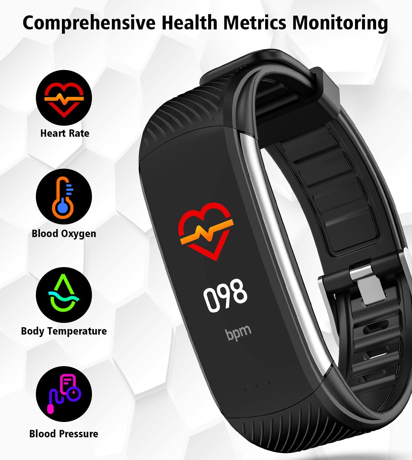 【Comprehensive Health Metrics Monitoring】 This slim, easy-to-use fitness tracker packs heart rate, blood pressure, blood oxygen, and body temperaure monitoring.You could check those real-time health metrics anytime, anywhere conveniently on your wrist and check all-day data record in APP DayBand. With app DayBand, you could turn on continous 24/7 heart rate tracking, and fixed time blood oxygen and body temperature tracking. Providing you complete information to help you manage your well-being.