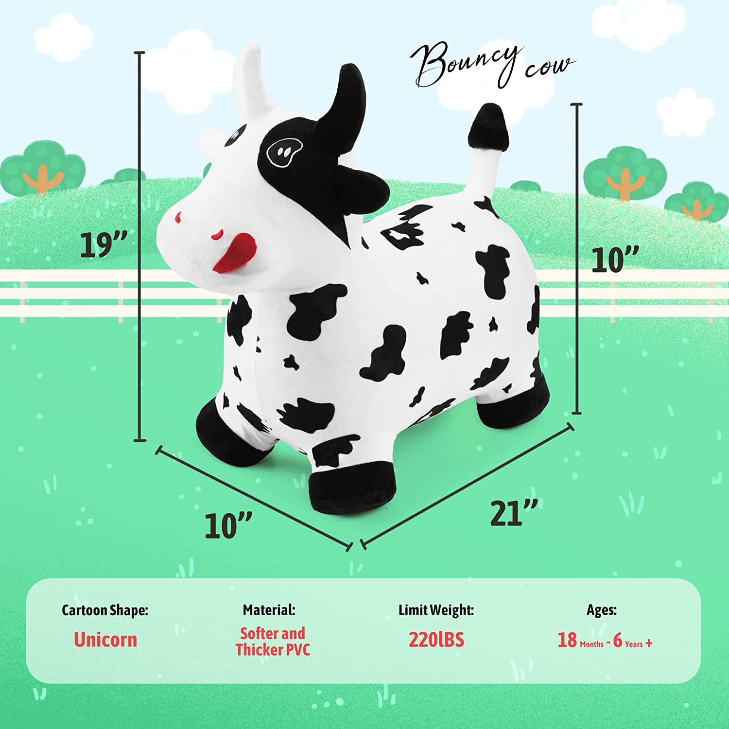 - ECO-FRIENDLY AND SAFE: Our bouncy cow are Phthalates, lead, BPA, and heavy metal-free, making them safe for your child to use. They have been tested for compliance with the ASTM F963-11 Toy Safety Standards, so you can trust that your child is safe while using our animal hopper.
