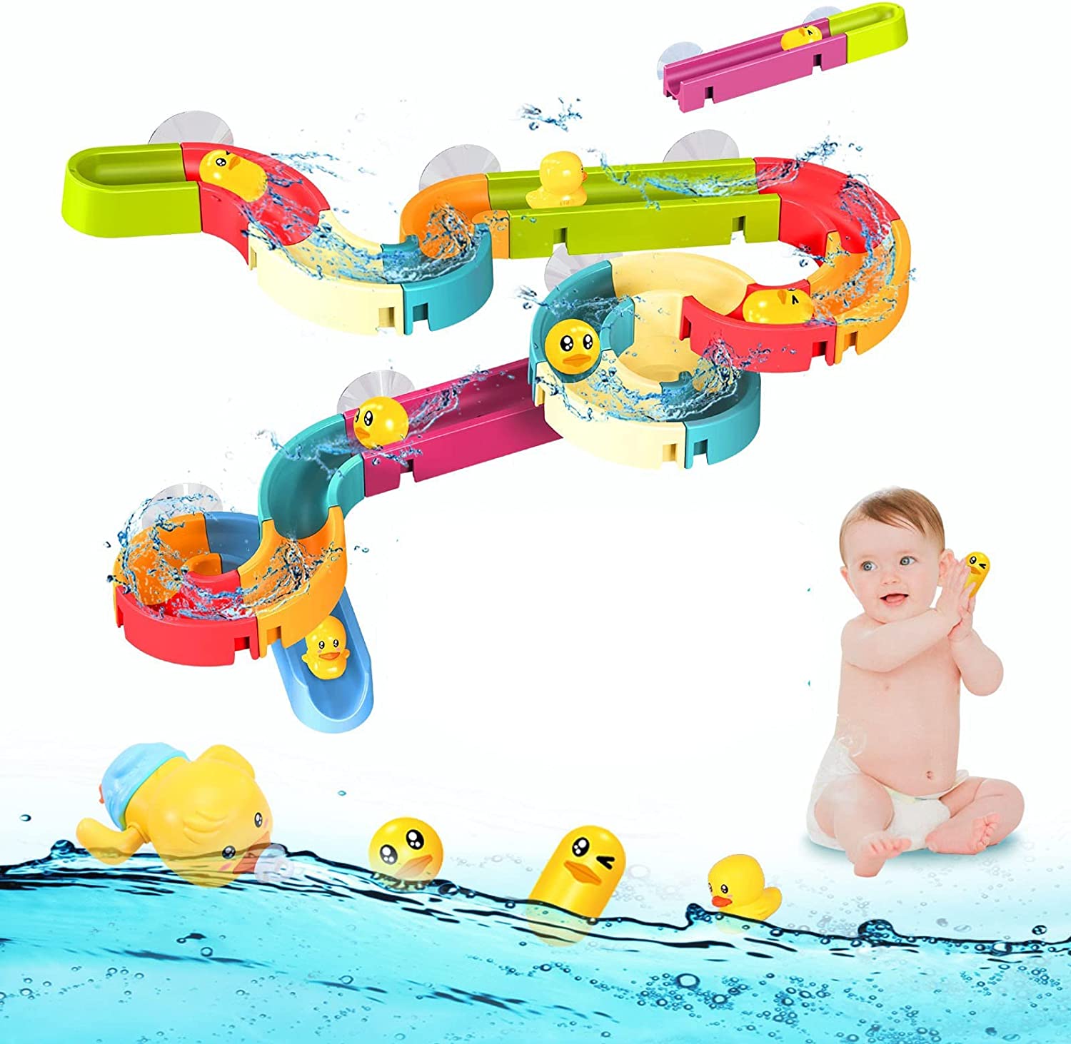 【Fun Bath Toy Track Game】This bathtub bath water track toy contains a total of 35 bath accessories, 20 * colored track pieces (random colors), 8 * suction cups, 1 * wind-up bath duck, 6 * mini duck toys. Kids can create a fun DIY bath toys, our baby bathtub toys provide all-round protection for your child, it is an excellent toy for your little one. Bath time becomes more enjoyable and faster!