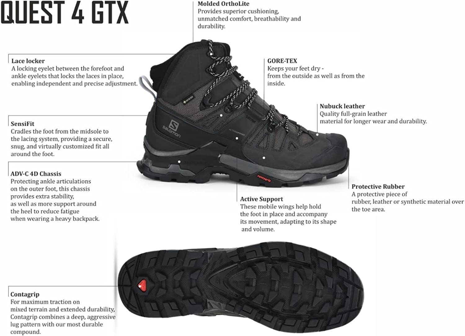 • Waterproof Backpacking Boots: Designed for long expeditions and tough conditions, the Quest 4 is grippy and supportive. We’ve updated the chassis to target sensitive articulations and wrap the foot for extra support