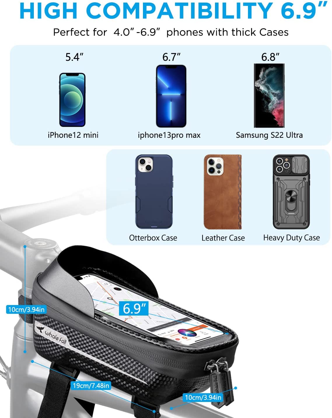 - ?【Easy to Install】Whale fall phone holder for bike is suitable for any bike with a frame. With three magic straps you can adjust the phone holder on the bike frame and top tube of the bike. The bike frame bag firmly fit on your bike! It never disturbs your knees or legs while riding.Tipps: Before you put your phone in the bike bag, please turn off the Aaccidental Touch Protection in the phone settings to prevent the phone from being inoperable after putting it in the bike frame bag.