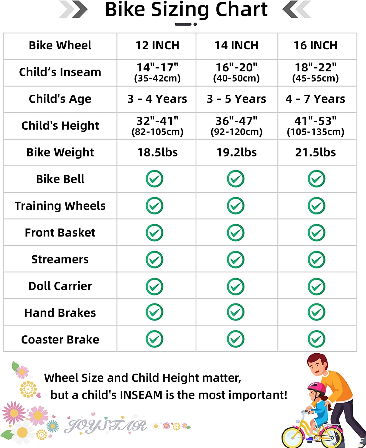 - 5. More Size Options! 12 inch bike is suitable for 2-4 years old (33-41 inch) girls; 14 inch bike is suitable for 3-5 years old (35 - 47 inch) girls; 16 inch bike is suitable for 4-7 years (41-53 inch) girls. Use our easy-to-follow size chart, you'll find a perfect size for your little beloved. Note: Please take the kids height into consideration.