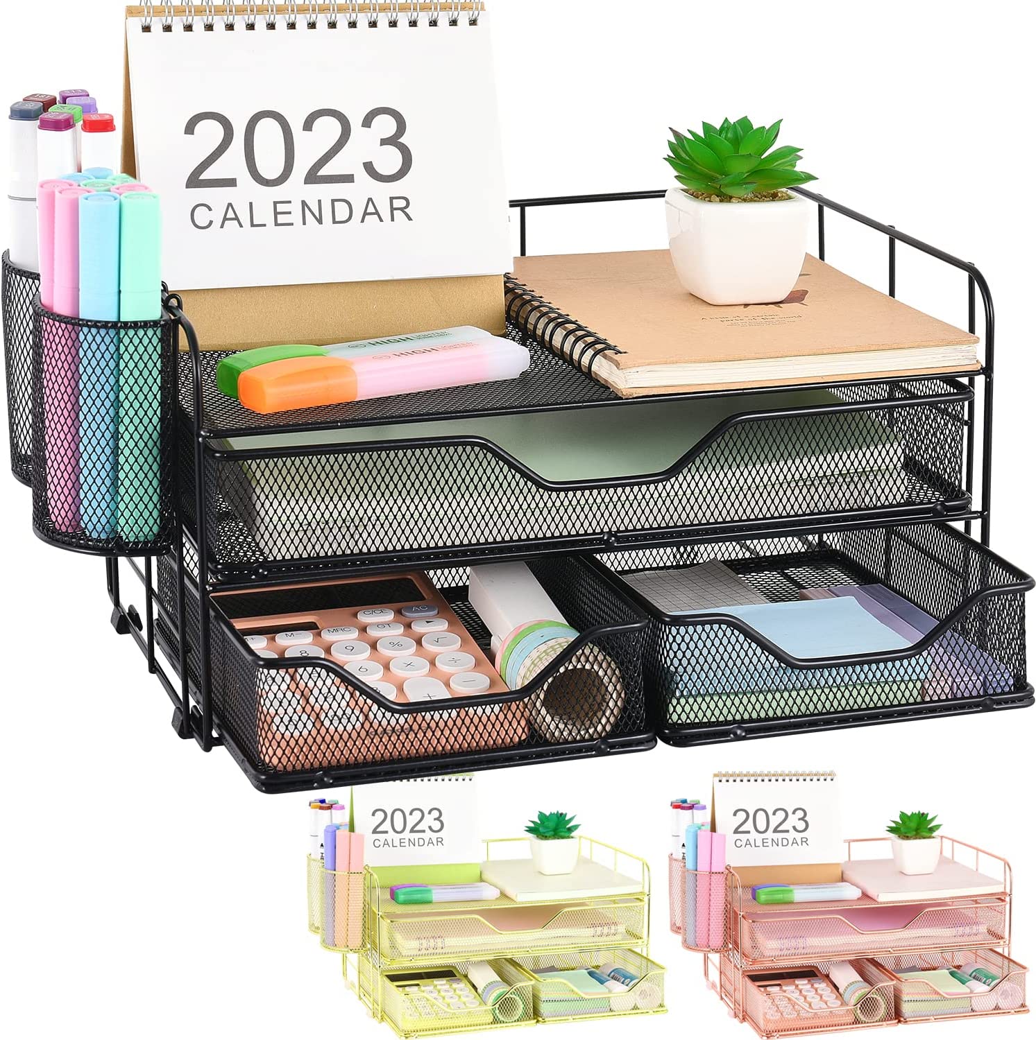 ? [Perfect Paper Organizer] Desk drawer organizer has open top storage space+2 hanging pen holders+3 different drawers. It is convenient for you to quickly identify and sort out desk accessories, letters, and greatly improve your work efficiency.