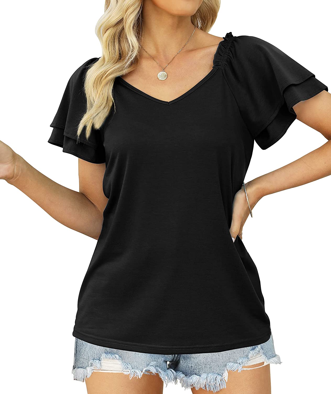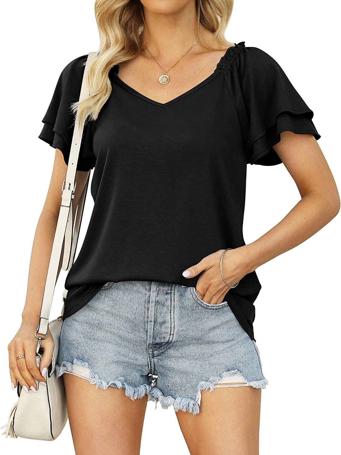 Feature:Cute Summer Tops for Women. Dual Layer Flounces Sleeves, Smocked Shirred, V Neck, Ruffle Sleeve, Loose Fit, Super Stylish!