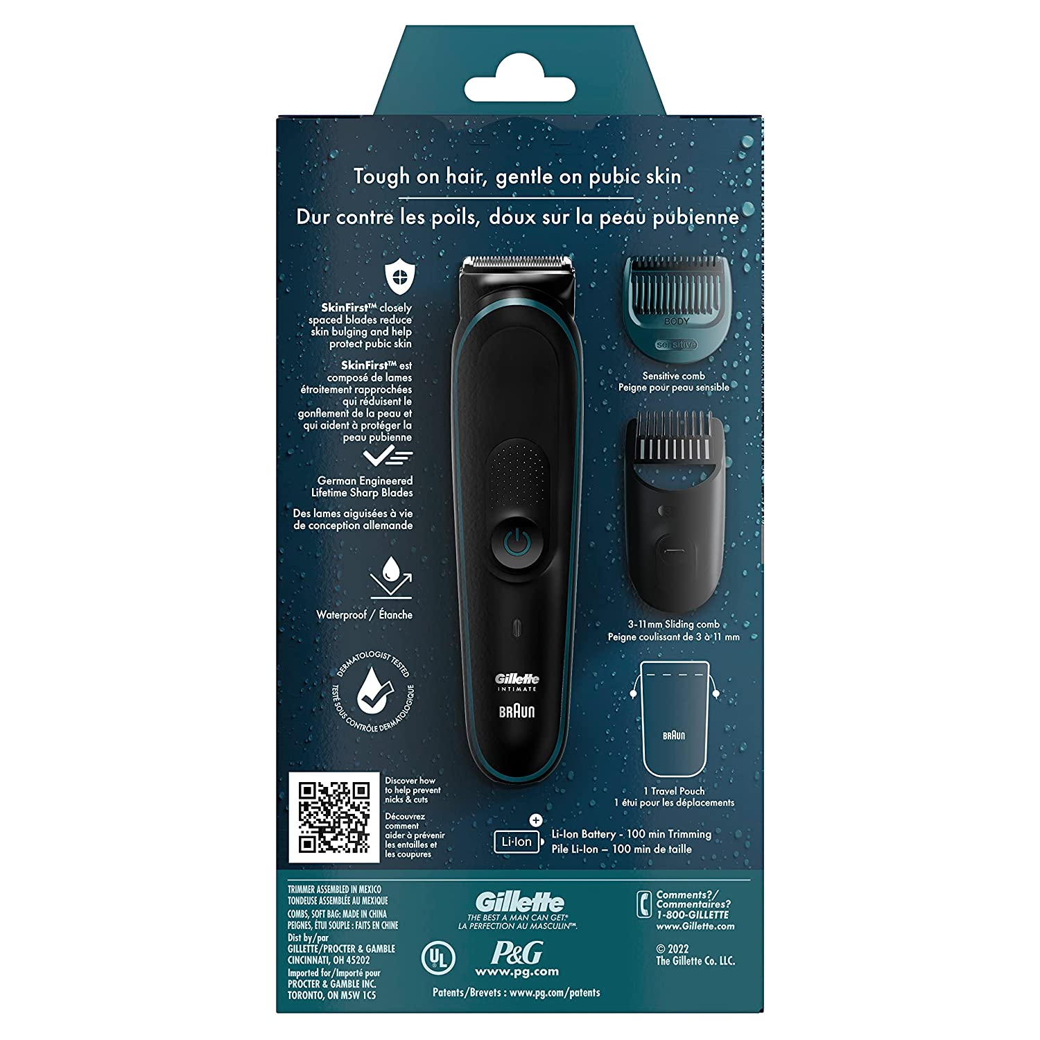 Meet Gillette's gentle and easy intimate shaving lineup that shows the proper respect for your region. Gillette Intimate Pubic Trimmer is Gillette’s first pubic hair trimmer for men, designed for gentle and easy grooming below the waist. Trim the hair with the 2 interchangeable skin-shielding guards. This electric pubic trimmer is cordless and has SkinFirst™ technology with closely spaced blades to reduce the risk to nick and cut the delicate skin. Powered by Braun, this electric men's pubic hair trimmer is equipped with a powerful Li-Ion rechargeable battery that lasts up to 100 minutes from a single charge. This waterproof pubic hair trimmer for men can be used wet or dry, so you can easily trim at the sink or in the shower, whenever you want, wherever you want. Gillette's intimate pubic trimmer comes with a charger, 2 lengths of interchangeable guards, a cleansing brush to keep hair out of your razor, and a soft carry bag. With Gillette Intimate Grooming, you have a routine so simple and easy that you won't need to plan ahead. For a complete intimate grooming routine, use the entire Gillette Intimate grooming line to help prepare, help protect pubic hair from shave irritation, and maintain your pubic hair & skin.