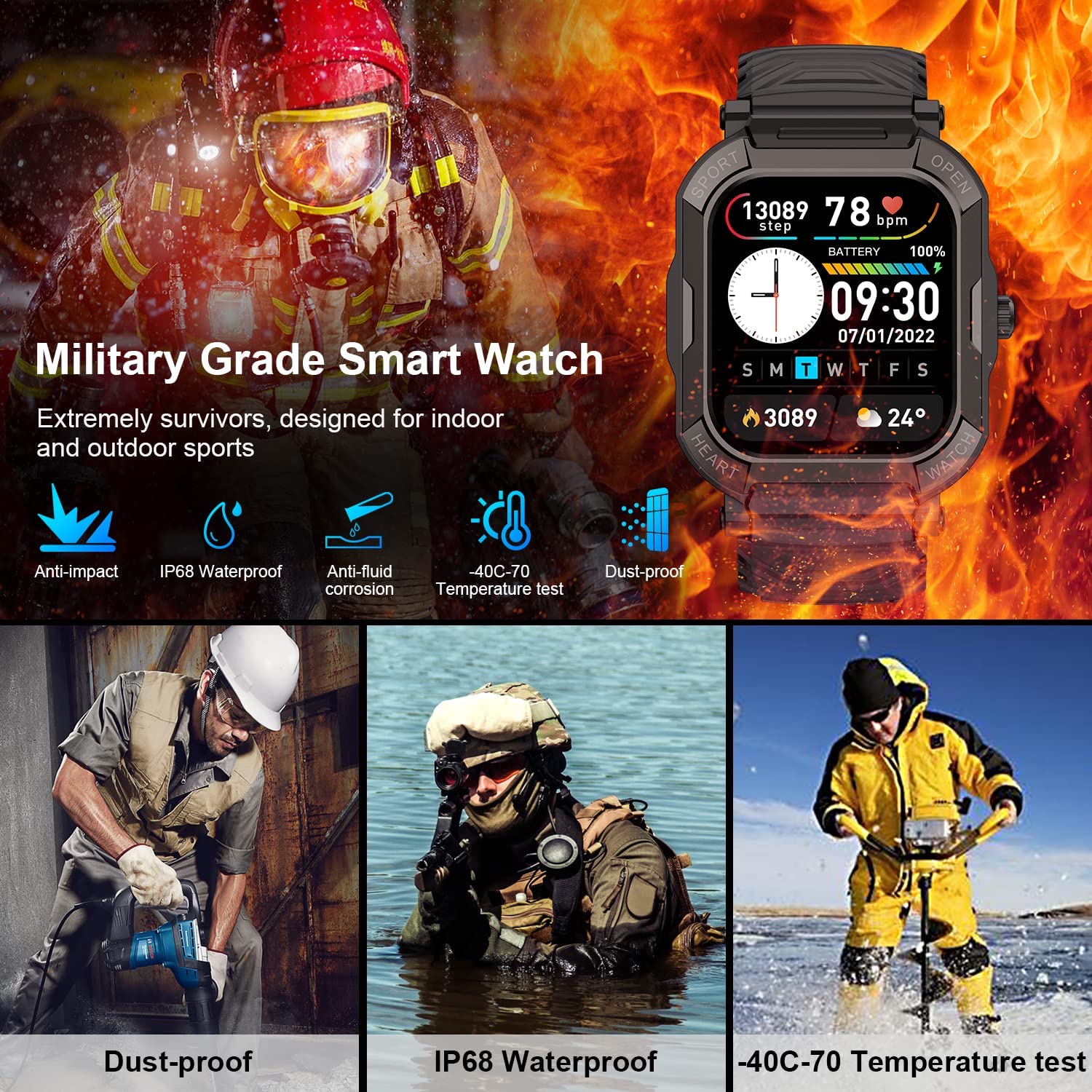 • Military smart watches for men - Special composite materials makes our running watch pass dozens of standard tests including temperature, low pressure altitude, dustproof, salt spray, fluid contamination, etc.Our military watches for men has passed drilling, crushing and hot steam scouring test which makes it suitable to be used in high temperature and high pressure environments. Rugged smart watch is going to be your ongoing reliable companion